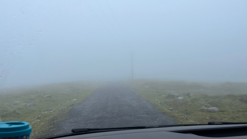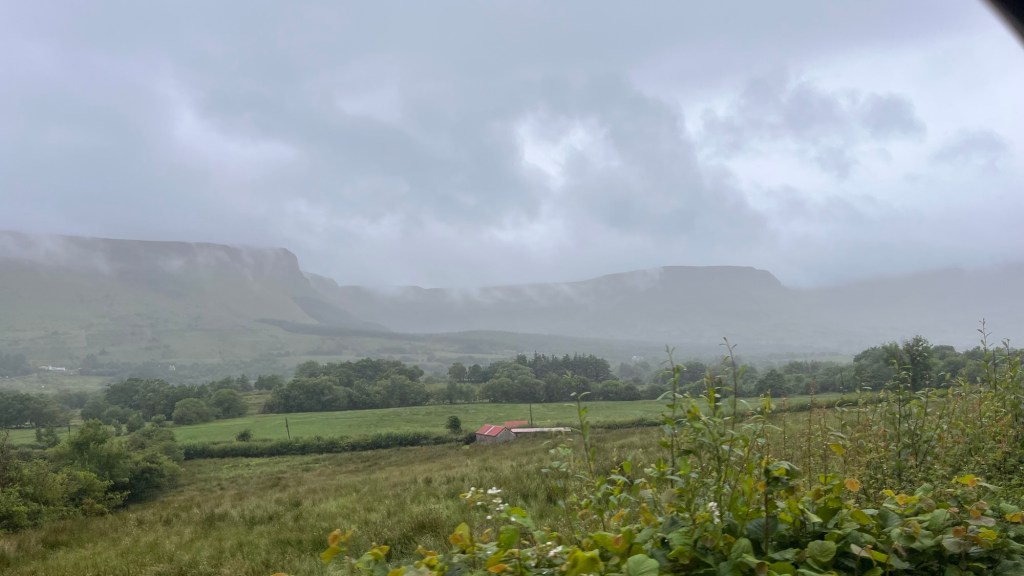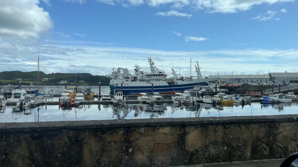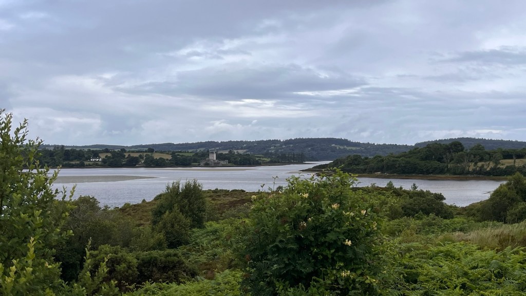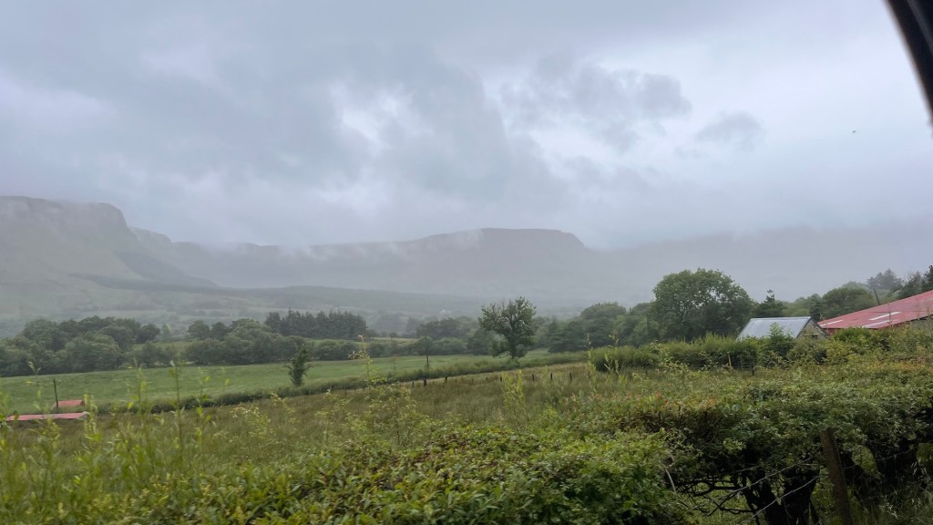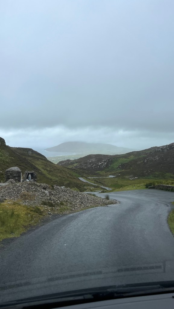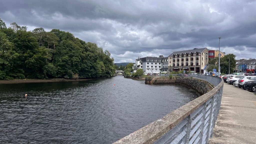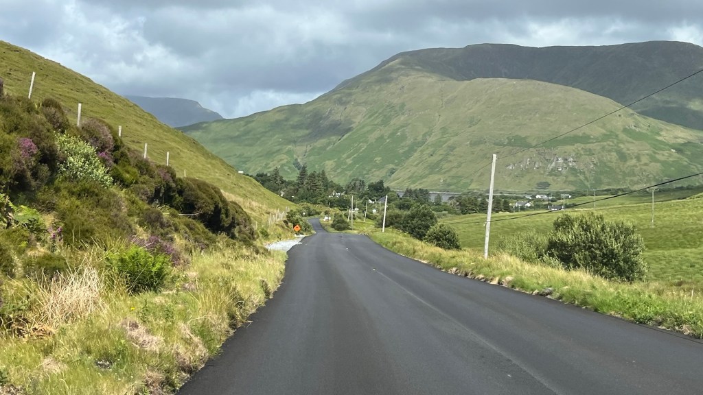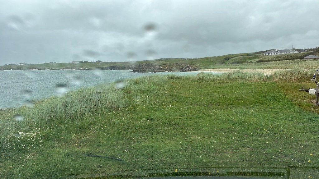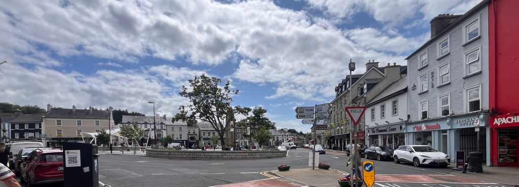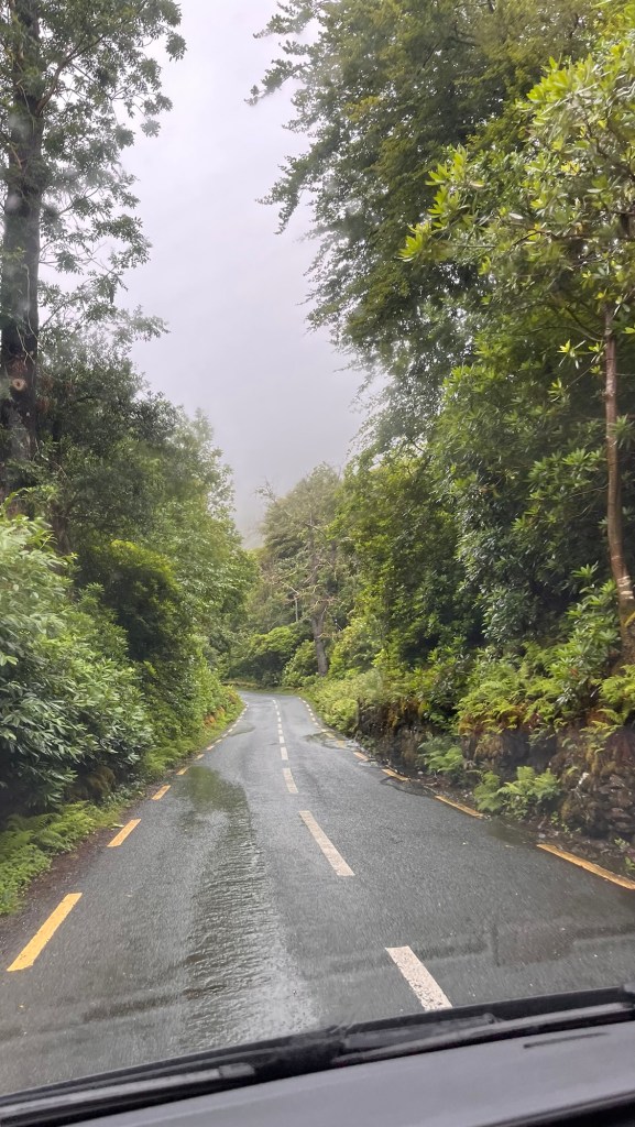 We headed down the lovely east coast of the headland through Rathmullan and Ramelton, two small delightful towns and onto Letterkenny, where the heavens seriously opened up – so hard that we were on double wash wipe with the windscreen wipers. It had eased off as we skirted the edge of Letterkenny – full of roundabouts, traffic lights, commuter traffic and queues. It’s always a bit of a shock to the system touching a large town or city.