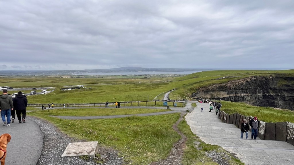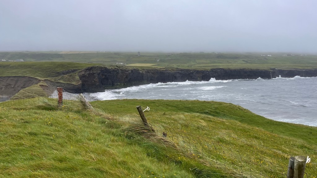 We fought to get out of the van with the wind and had a wander around, taking photos to prove we were there. A band of rain was coming across the bay, so we went to the little coffee trailer and ordered coffee and cake from the young girl sheltering there. There were a few brave souls braving the weather, wandering on the headland, but we retreated back to the Van to consume our most northerly Irish cup of coffee and our most northerly Irish piece of cake before heading off.