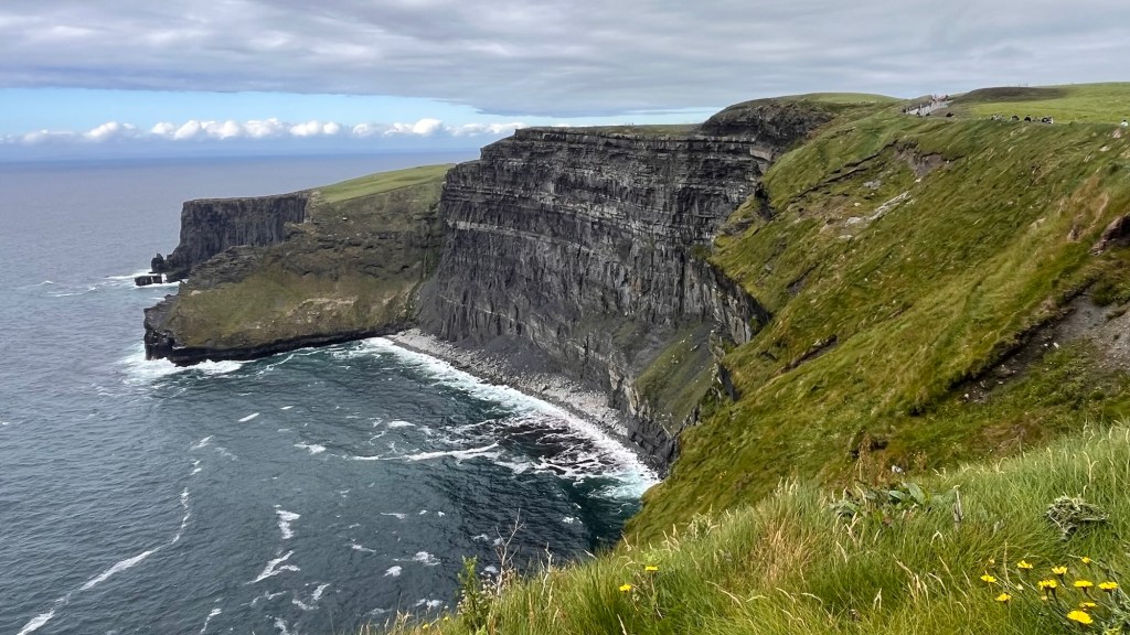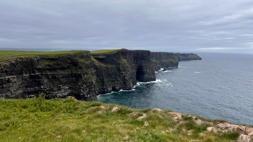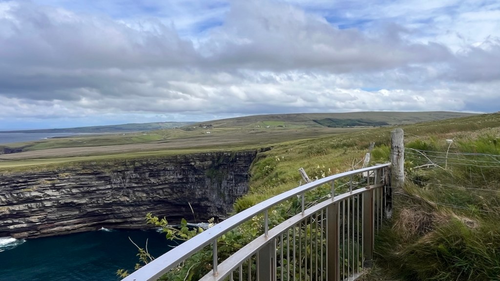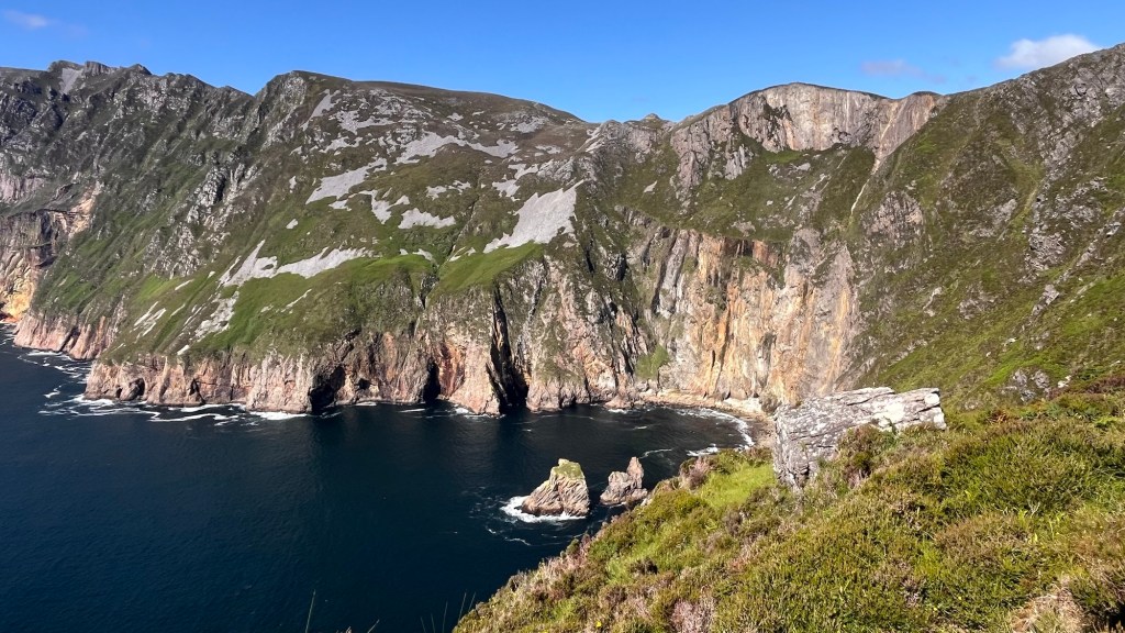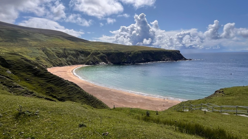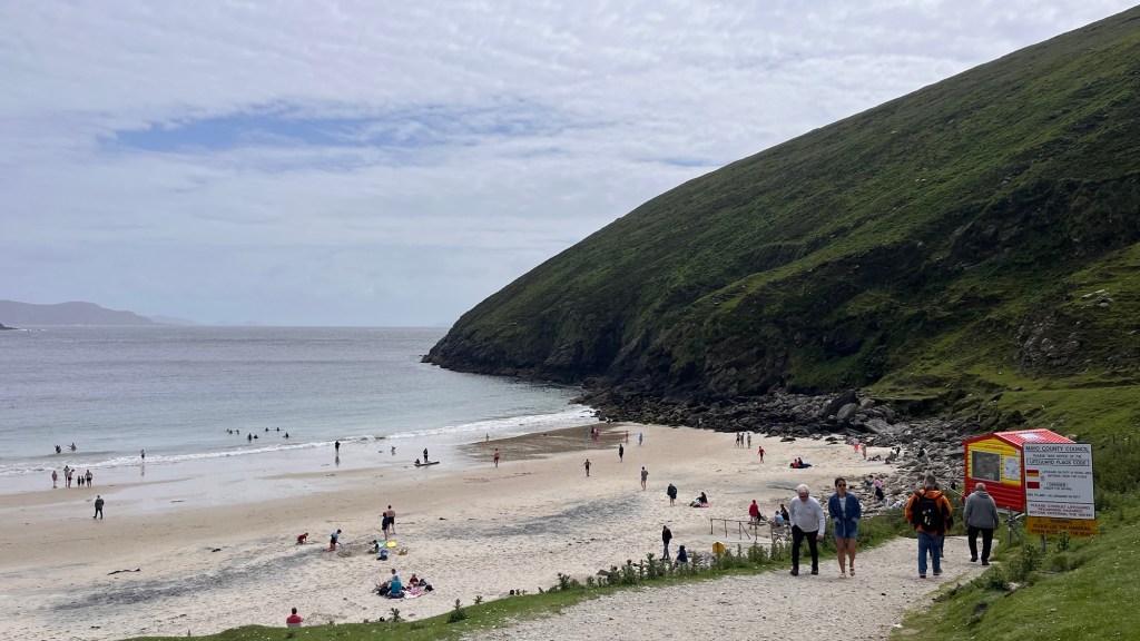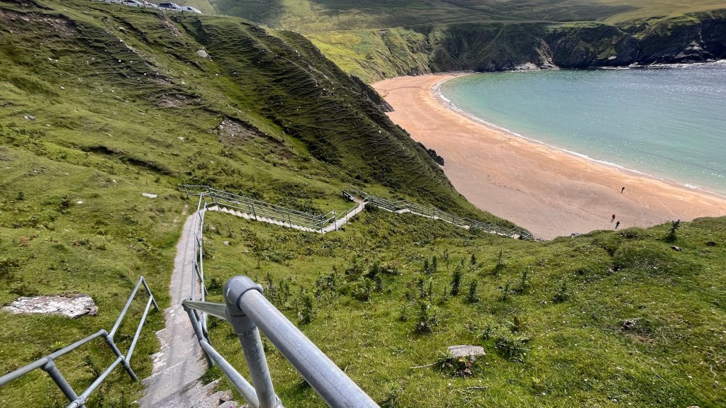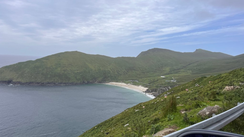 The scenery on these headlands are just jaw dropping and at every corner, there’s another fabulous surprise! Ballymaststocker viewpoint was no exception – half way up a craggy hill just beyond a couple of hairpins, the view was amazing – overlooking sandy bays, the distant headlands, Carrickart in the background – it was one huge amazing vista.