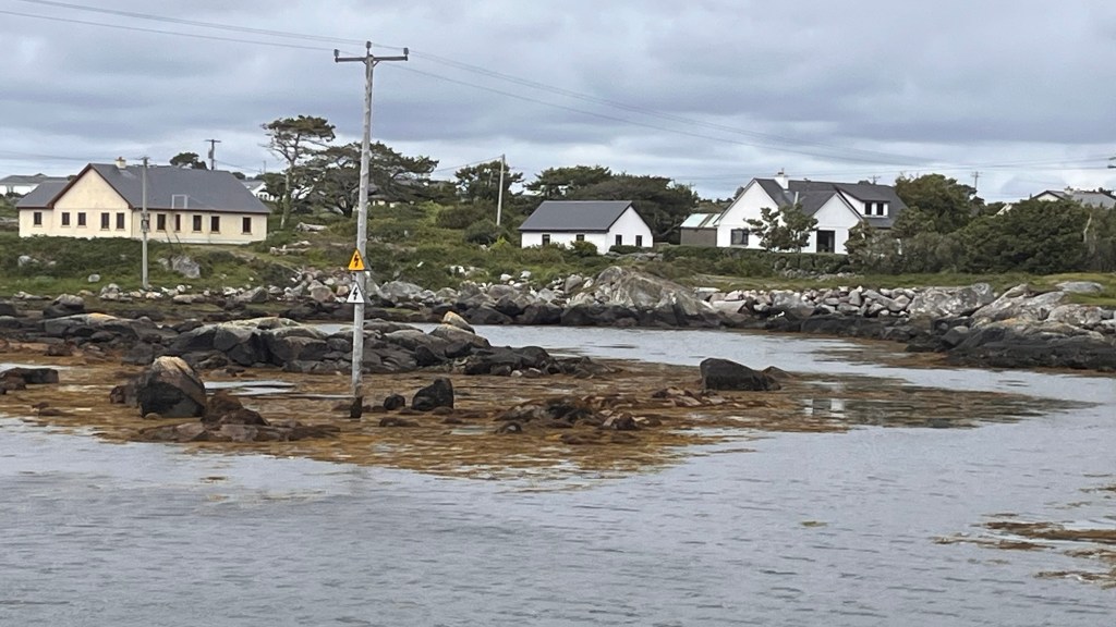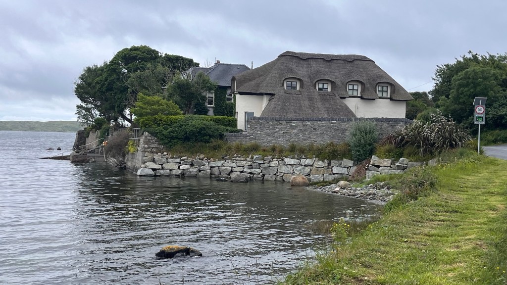 There were puddles everywhere from the downpour along the little roads. We trundled along the little back roads, cursing as yet another car came up behind us. This was getting a bit of an annoying trend, so it seemed – we could be on normal main roads and have nobody behind us for miles but as soon as we got on the remotest backwater of a lane, a car would appear in our rear view mirror. It was uncanny. As we go fairly slowly, we don’t like holding people up, so we indicate and pull over to let them pass. It seems a new concept for the Irish driver as they have a tendency to hesitate, wondering what we’re up to, before gingerly passing us.