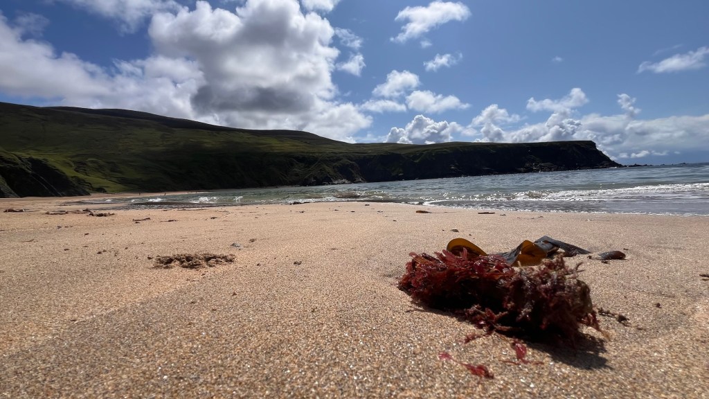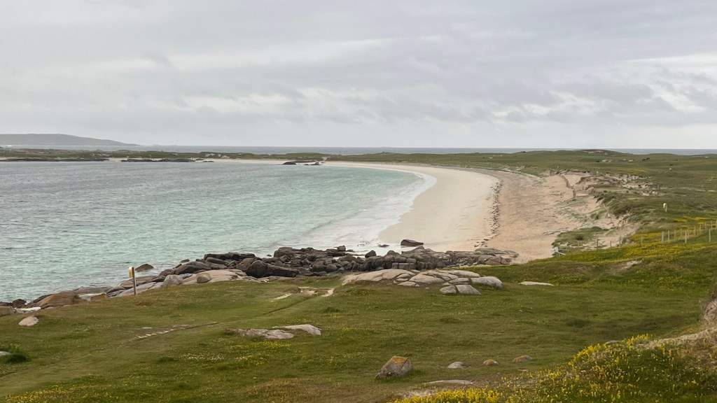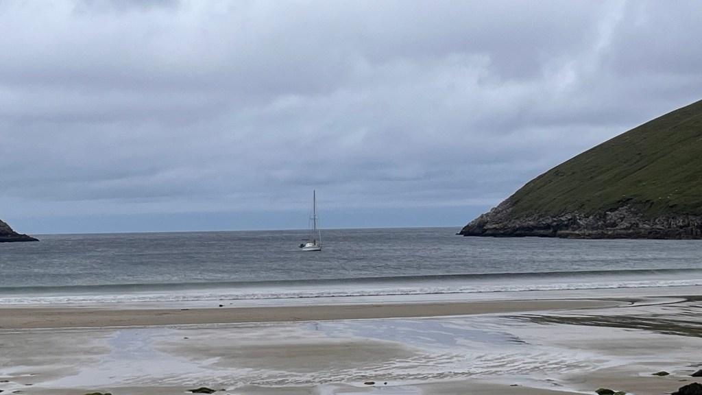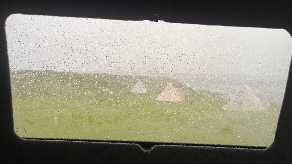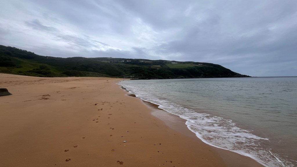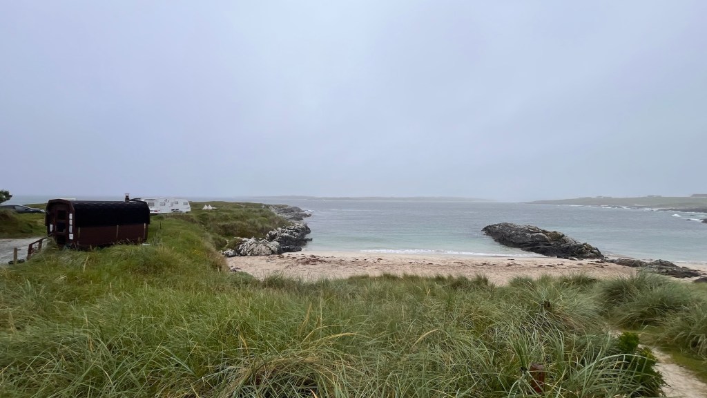 With the weather closing in, we had no option than to go to the nearby Farren’s Bar for a most northerly Irish pint of Guinness in the most northerly Irish pub as we had celebrated this moment in the south and west. It was a convivial place to scratch our heads for our campsite conundrum. As we were leaving, one of the pub guys started up a conversation while scratching The Pup’s ears and suggested we should go to Kinnagoe Bay, down the coast and go off grid. So we did. We dropped down a steep road onto a tarmacked parking area which overlooked the most amazing bay, surrounded by tall grassy cliffs and a sweep of sand. It was perfect. There was one other car, the owner letting his dog have a run on the beach and so Hubby and The Pup went to join them. Another car arrived, but after a few photos, they disappeared again.