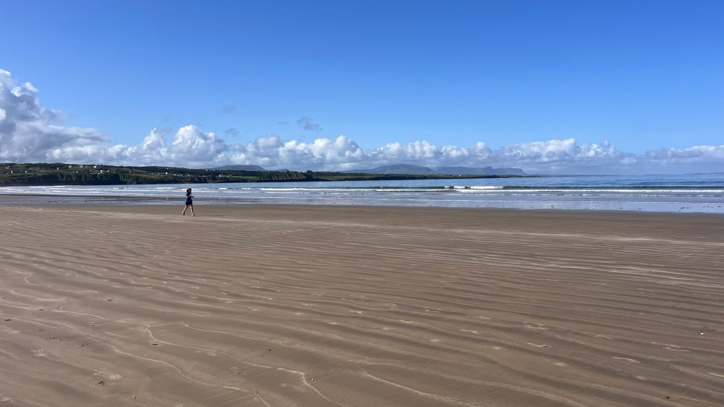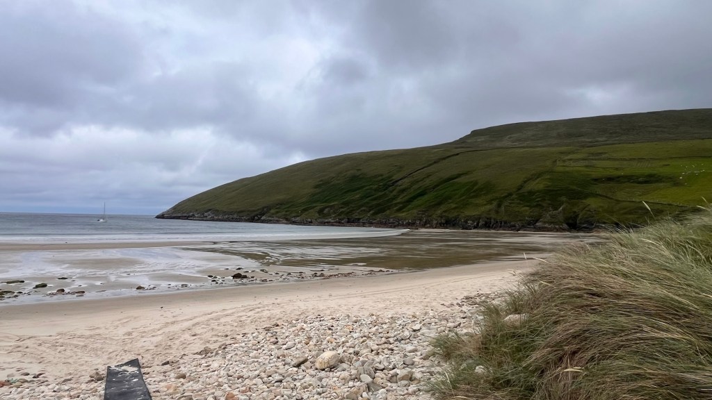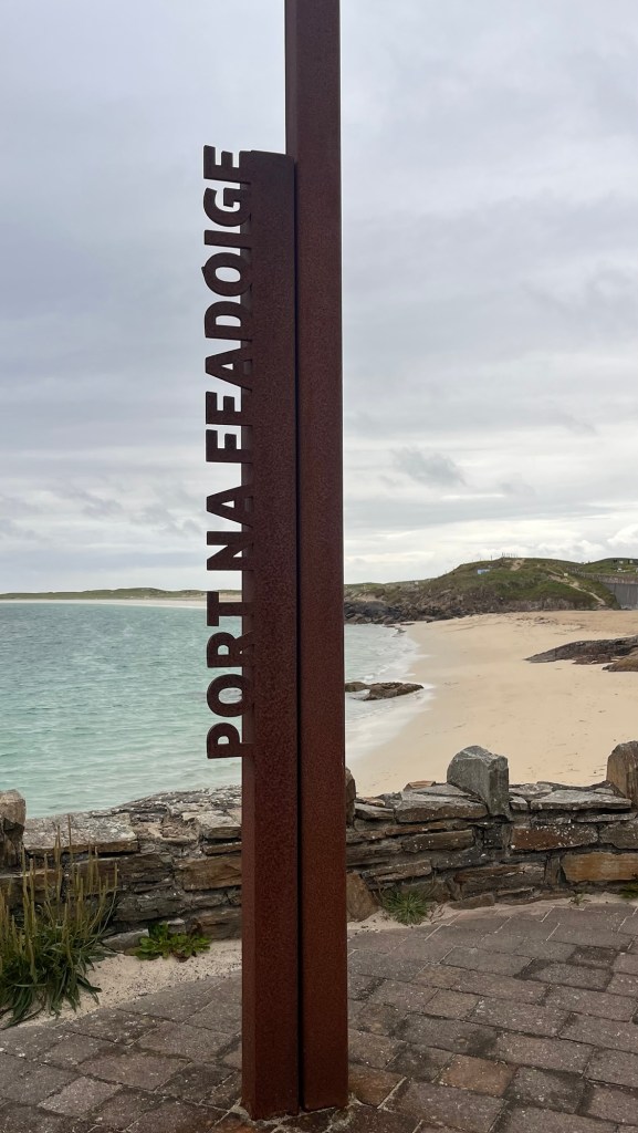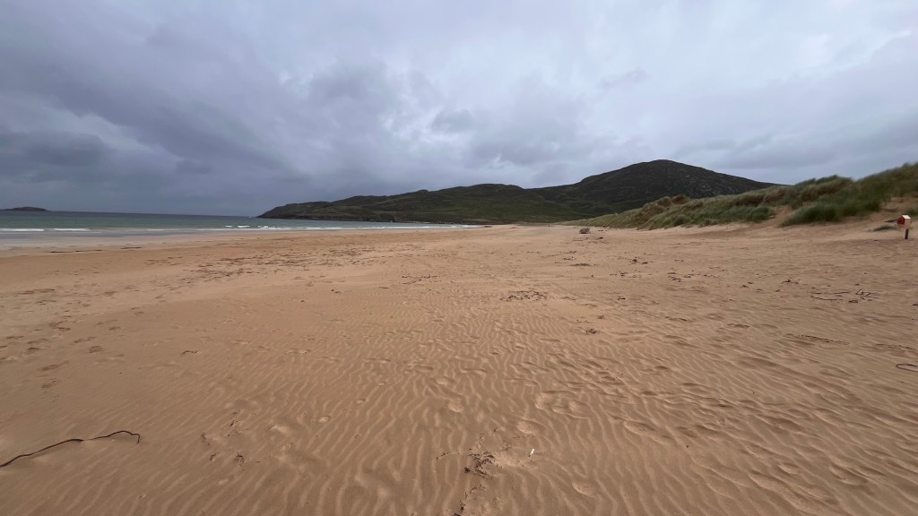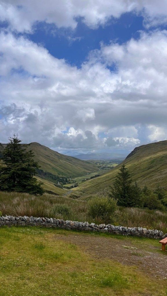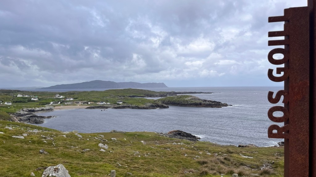 At Carrickart, we headed onto Rosguill, following the WAW signs which were also part of a designated scenic tour. We stopped at Rosann beach, a beautiful sweep of sand where The Pup met a collie and they chased each other – saves walking them. The clouds were dark and angry on the horizon and as we got back to the Van, it started to spit. We carried on- the landscape was stunning. In fact, I couldn’t keep up with the note taking, it changed so much. Just majestic coastal mountains, craggy outcrops and delightful little valleys.