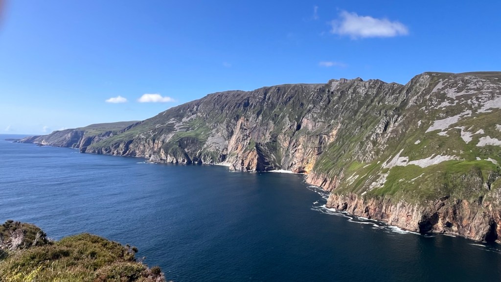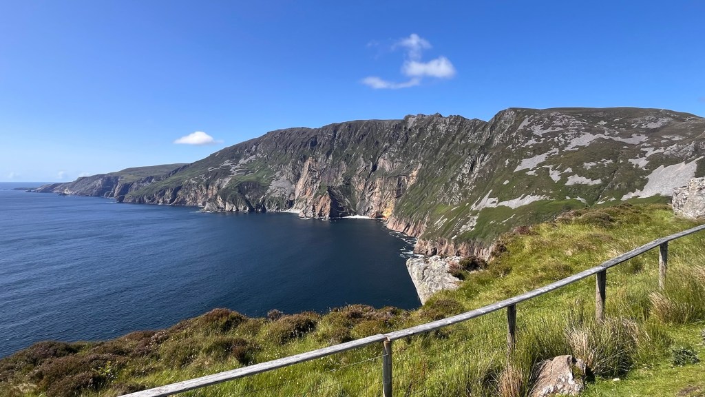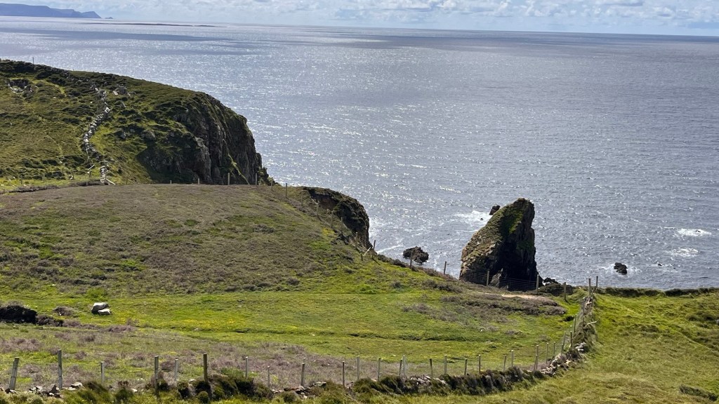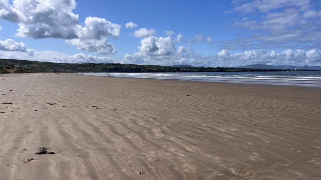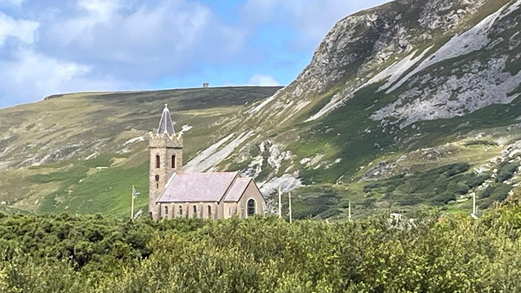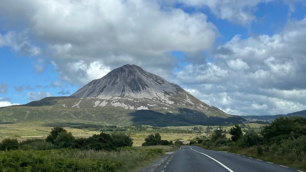 We went through Buncrana, picking up the WAW up to Fort Dunree, perched on its rocky promontory and built for the Napoleonic Wars. Then the long straight climb up the Mamore Gap, where the holy well of Saint Eigne is found and is one of Ireland’s “magic roads” – an optical illusion whereby a stationary car appears to roll up hill. As we were the only ones up there, we were unable to verify the theory. The view on the other side was far reaching and spectacular as we trundled back down.