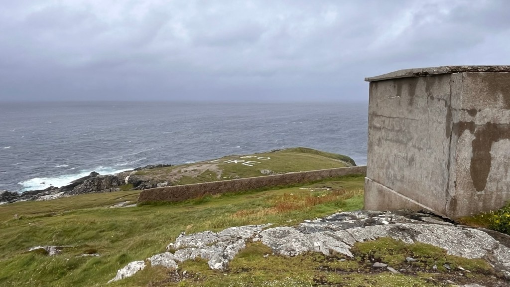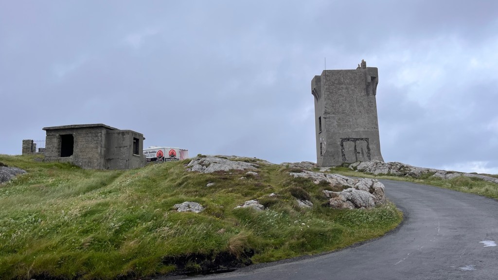 It was howling a hoolie at Malin Head, an extremely exposed piece of headland with a signal tower. There are many old stone signal stations along the Wild Atlantic Way, built between 1804 – 1806 in preparation of a possible Napoleonic invasion which never happened in the end. Each station is spaced so they can see each other and signaled by using a flag system. The one at Malin Head had been rendered which was now falling off, so it had a rather neglected, if not brutalist look about it.
