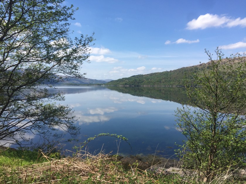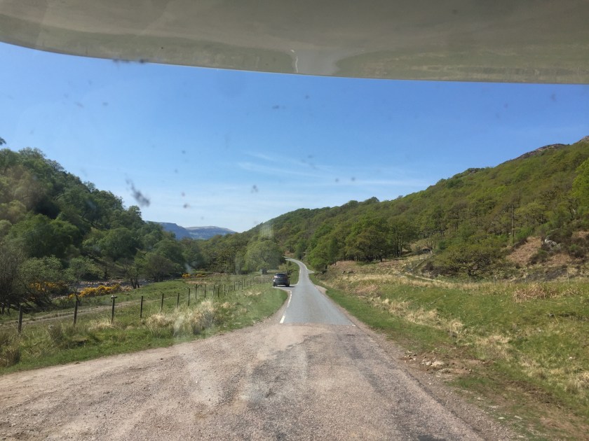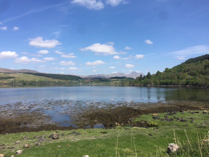 The road we’re following is treelined on one side and Loch Linnhe on the other. I’m on otter watch yet again. You never know! It’s so gorgeous. We meander along the road, passing cyclists and again wondering how isolated the houses are. Finally we drop spectacularly towards Loch Sunart and into the little village of Strontian, a very pretty village, probably the best we’ve seen. We stop as it’s nearly lunch and find a scruffy little cafe with fantastic food. I had haggis with jacket potato and it was delicious. We have a wander for provisions, cash and a couple of little gifts from the tiny little gift shop with a grumpy Spaniel. There’s a great sense of community and listening to conversations, there’s pride in the area. I could live here, I thought. It’s just a lovely place with trees on the green, a river (though we couldn’t find a way down there for The Dog to paddle her feet – not impressed). In the dappled sunshine, it was clean, tidy and quiet. Then I thought, in the pouring rain in the middle of winter, it’s a completely different story.