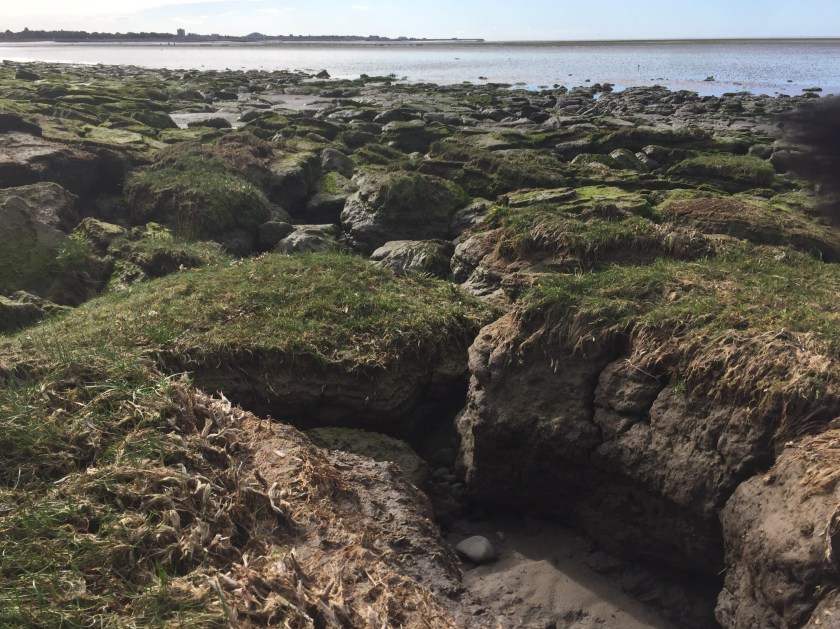 We wandered along – the tide was out and had left puddles of water which The Dog gleefully jumped into. She’s easily pleased. The sun highlighted the mud flats and the deep crevices and shadows. It just all really stood out.