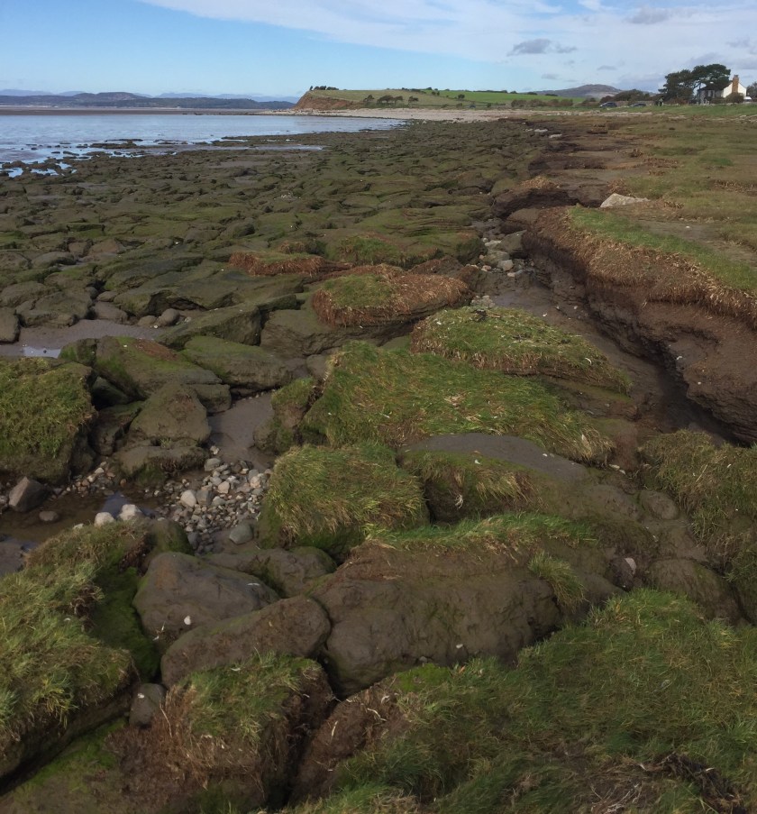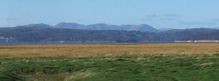 We arrived at Hest Bank – I’ve blogged about this area before. We parked up near the railway level crossing and stood on the grassy foreshore. The Dog galloped around madly while I stood and admired the view. It was a beautiful clear day – the fells of the Lake District were sharp and clearly defined. They were blue, purple and mauve with deep shadows enhancing their shapes. The town of Grange over Sands glinted across the water and everything seemed to sparkle. It was one of those days where you felt you could ping the sky with your fingers like on glass and sing “Zippity Doo Dah”
