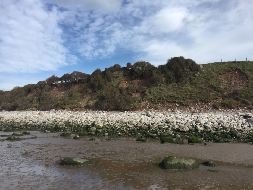 I kept The Dog downwind of me and we wandered on the seabed, the worms and other sand creatures buried, leaving thousands of swirls of glistening mud across the beach. A nearby cliff showed recent movement with mini land slips sliding to the pebbles below.