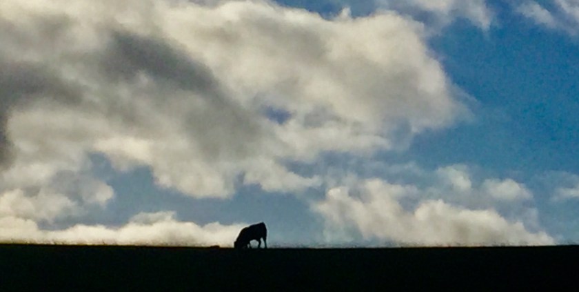We entered another field full of sheep, who scattered as we neared them. The Dog was pretty good ignoring them and walked by my side, on her lead, but still the sheep scampered causing little stampedes as they spooked their neighbours. Then, one particular sheep looked up, stood its ground, stamping its forelegs belligerently. I was quite surprised at its audacity. It remained there, watching us pass with its beady eyes, it’s feet still drumming on the grass, refusing to gallop off. I hadn’t come across a sheep with such bravado and was half expecting it to charge at us and butt us (thankfully it didn’t have horns). I sort of adopted a funny sideways trot to protect my backside from a possible attack. What a wuss, but this animal looked like it meant business. Thankfully, it just followed us with its eyes with a look of “and don’t come through my field again!”