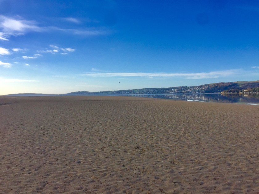 We rolled into Arnside and parked in our usual spot, overlooking the estuary. It was quite busy despite today being the first day back to work for many workers after the Christmas break, but the kids weren’t back to school yet so probably there were still lots of people enjoying another week off. The Dog bounded onto the beach in sheer delight – she had had too many short walks and on leash lately while her humans had been too busy celebrating, suffering from the after effects and from illness and now she was free! I caught up with her, noting how still the water was – it was like a millpond. It was beautiful. We wandered along the shore, walking towards Morecambe Bay. There were quite a few people out, doing the same as us – getting some air. Fishermen sat fishing on the waters edge despite the biting cold, waiting for the fish to bite.