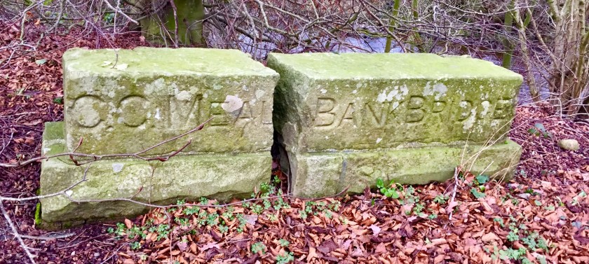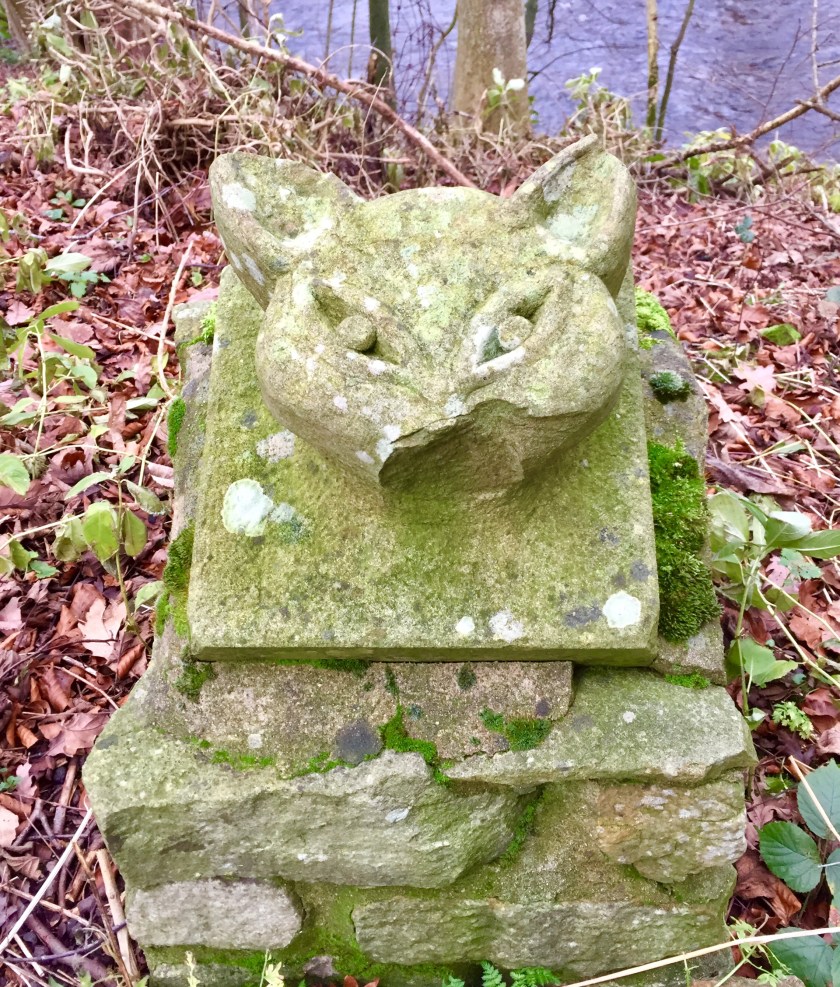 We soon came to a gate into a field of sheep, so The Dog went back on lead and we walked together, following the river Hindburn. We passed the Environment Agency’s flow monitoring station and then towards the main road. Here we paused as I had spotted a couple of stone slabs – one marked Meal Bank Bridge and the other with a cat like head carving.
