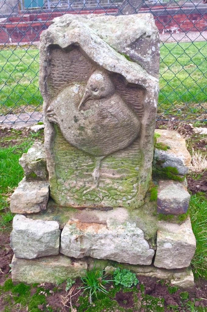 We followed a muddy bridleway between two fields away from the village and let The Dog have a run. We approached the sewerage works by the river and discovered yet another stone carving. The Dog discovered another path. We followed it, but it just led to the river and a dead end so we retraced our steps. I hadn’t planned to deviate, but we found another path on the other side of the water works and we followed that through a couple of fields, found a track that led us back towards the village. We found more stone carvings.