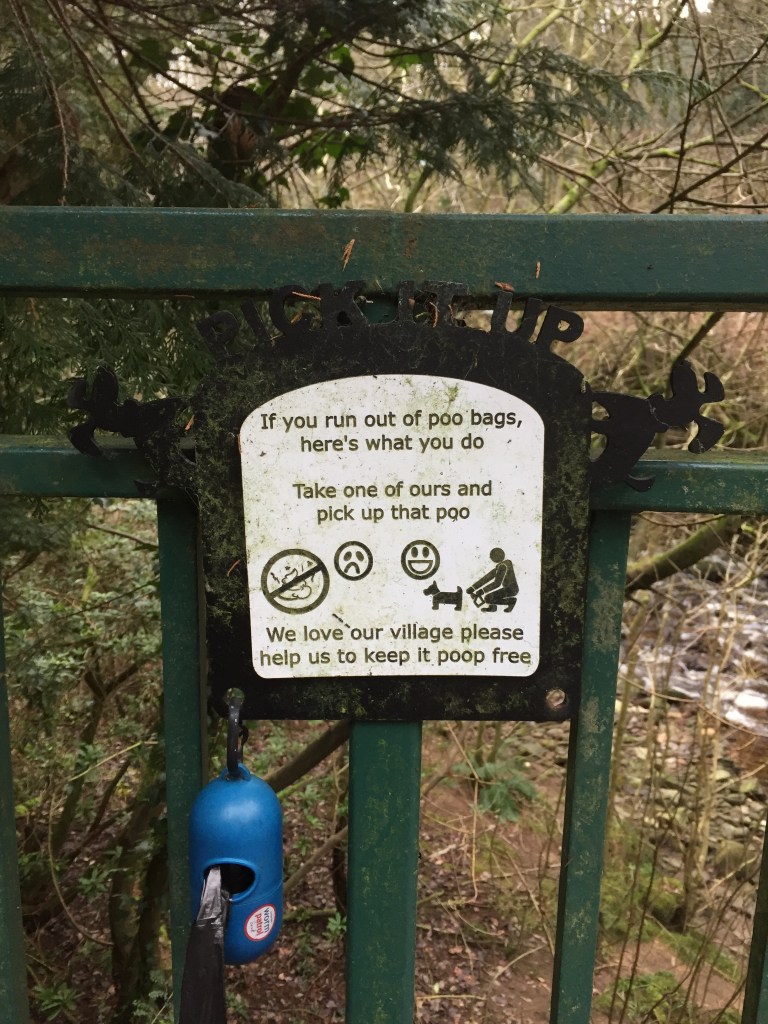 I stood looking at the school with its tiny front playground, wandering around the side road to the front entrance and another play area, wondering what it’s like to be a pupil there – instead of having 30 classmates, you had half of that or less. I carried on with our walk, down a little footpath and towards the River Roeburn that flows into the Hindburn. It’s like a little gorge. On the road, houses cling to the sides, their gardens disappearing towards the river. It’s here that I spot a lovely little sign.