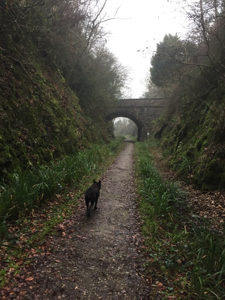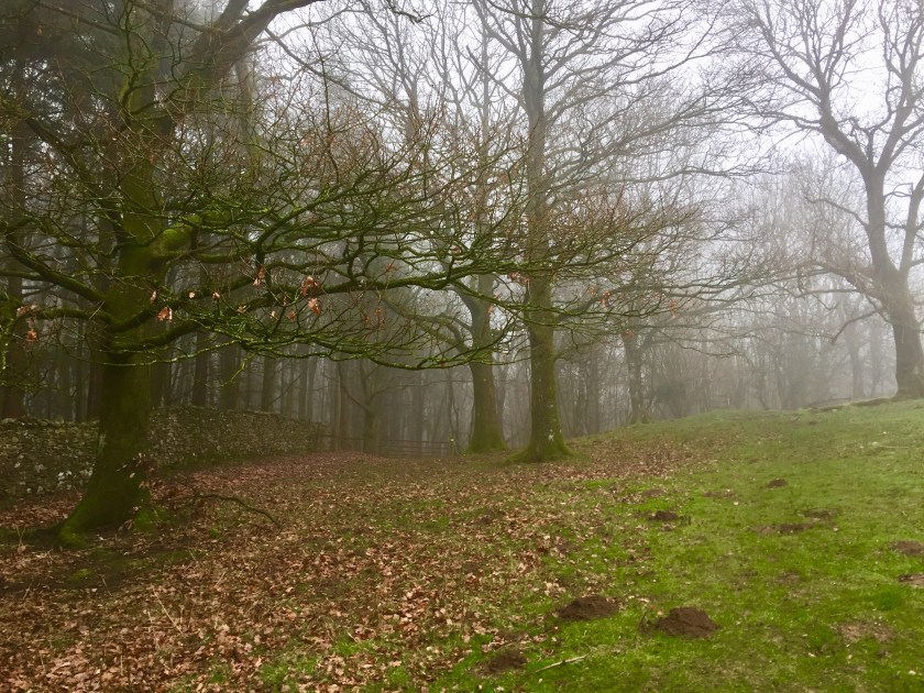 Finally at the top, we took a path left into the woods and unleashed the dog. A sign pinned to a tree notified us that red squirrels had been spotted in the woods and that we should report any further sightings. On a day like this, they’re probably curled up snugly in their nests, but we were quietly delighted. The poor old red squirrel has been repelled for many years by the non native grey squirrel and has only a handful of strongholds namely in Northumbria and Formby on the west coast (to name two of the sites) remain. It was lovely to find that they were establishing themselves here. We carried on through the trees, turning left and upwards. The mist seemed to get thicker. As we approached the top, we came across a mound with a concrete door imbedded in its side. We looked at our map, but couldn’t figure out what it could be for. Initially we thought it was a dam for a reservoir, but there was no lake. Our imaginations started to run away with us as it looked like an old nuclear bunker, but around here? Later after a little bit of Googling, we discovered its true purpose. It’s apparently a holding tank for water, that’s been pumped up to the village. The link below had a little information on it – it’s called Haverbrack Tank!