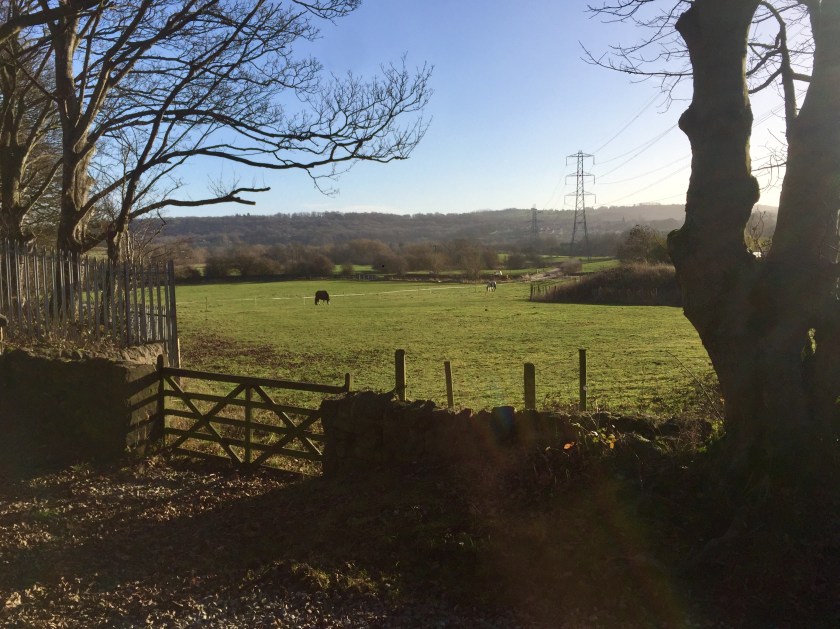 So off we set, the Dog dashing up ahead and me peering into the canal boats. There are a couple of really pretty, well cared for boats today – all clean and shiny. We follow the path towards Apperley Bridge, leaving the housing behind and the open valley of the River Aire. The valley is a classic lesson in physical geography – a railway, the canal, the River Aire and electricity pylons marching in between, only the road is missing, sitting on the hill above. Workmen are on the railway and there’s a plaintive bleeping alarm sounding across the fields which increases as a train approaches, warning the workers to clear the line. Then once it’s safe again, the alarm returns to its sedate bleeping. It follows us up the valley.