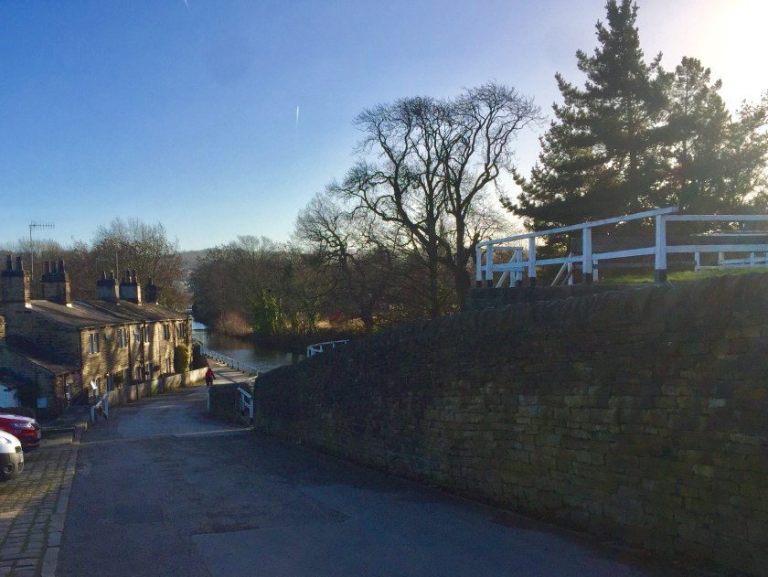 The sun is warm in the sheltered parts, but the wind is eye wateringly cold and I’m walking into it. We enter the outskirts of Apperley Bridge, on the edge of Bradford. It seems full of modern housing and this past year or two, estates have been popping up all over. The only good thing, is they have been built on former factory and warehouse sites, but the whole area seems a mass of identikit houses as far as the eye can see. We pass under the main road connecting Leeds and Bradford, pass the marina and across another road. Here a huddle of stone cottages overlook a vast double lock, together with the Canal and River Trust offices, probably once the lock keepers cottages. We peer into the murky depths of the lock, look into the open door of the Canal and River Trust offices – nothing exciting – and carry on where we’re soon back into fields and farmland.