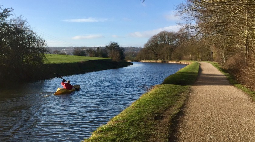 I would of liked to walk further, but then you have to walk back. So we turned tail and sauntered back whence we came. The wind was in our backs and the sun shone. There were all sorts of people out – mums with prams, elderly couples holding hands, friends chatting – we all smiled and said hello to each other. The Dog galloped after ducks in the water and woofed at them. A canoeist paddled slowly up towards Apperley Bridge – what a lovely way to travel, under your own steam. The railwaymen had repaired the track and disappeared together with their annoying beeping alarm. It was a glorious day.