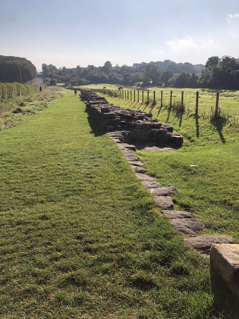 We got our rucksacks. We had ordered a taxi to take us back to Heddon-on-the-Wall and the exactly same spot where we stopped last night. It wasn’t cheating. We took a selfie to remind us in later years, how we managed to miss a hotel and set off. We headed first, to the edge of the village and the first glimpse of the Wall. A long stretch of stone and mortar heading gently down a slope in a field. It didn’t seem real that 1800 years earlier, Roman centurions had lived and worked here in arduous conditions and we stood there, chatting to a dog walker as cars whizzed by on the main road and an housing estate abutted the field.
