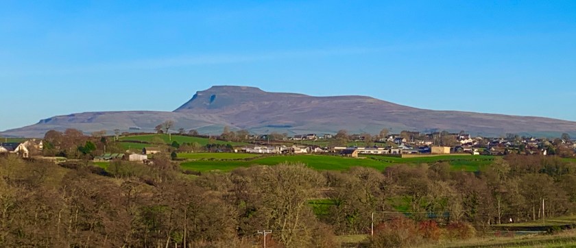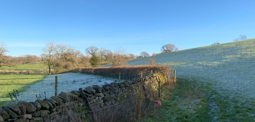 We were trying to avoid the fields which were sodden and squelchy, so we stuck to the roads. We walked up Mill Lane where many years ago, a thriving silk mill employed the local people. It’s now long gone and replaced by a small attractive development of flats and houses. The road inclined upwards and soon Ingleborough hoved into view – tall, majestic and watching over the little communities around it. The frost was thick up here, hanging off the grass. It felt like Christmas. The road dropped down again and bore left, where water had snaked its way across the road. It had frozen and had become an ice rink. We took it steady, checking where our feet were going and hoping not to do a Bambi. We traversed it without mishap and carried on to the next corner and studied the vista across High Bentham, Ingleborough and the Yorkshire Dales. It was stunning. Not a cloud in the sky.