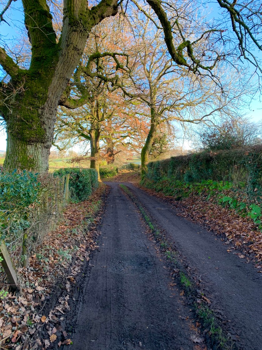 We walked a little further and then plunged left down a bridle way. The trees were bare and stark against the sky, a few final brown leaves hanging on. Towards the Lake District, the distant fells had little caps of snow on them. It had been a cold few days.