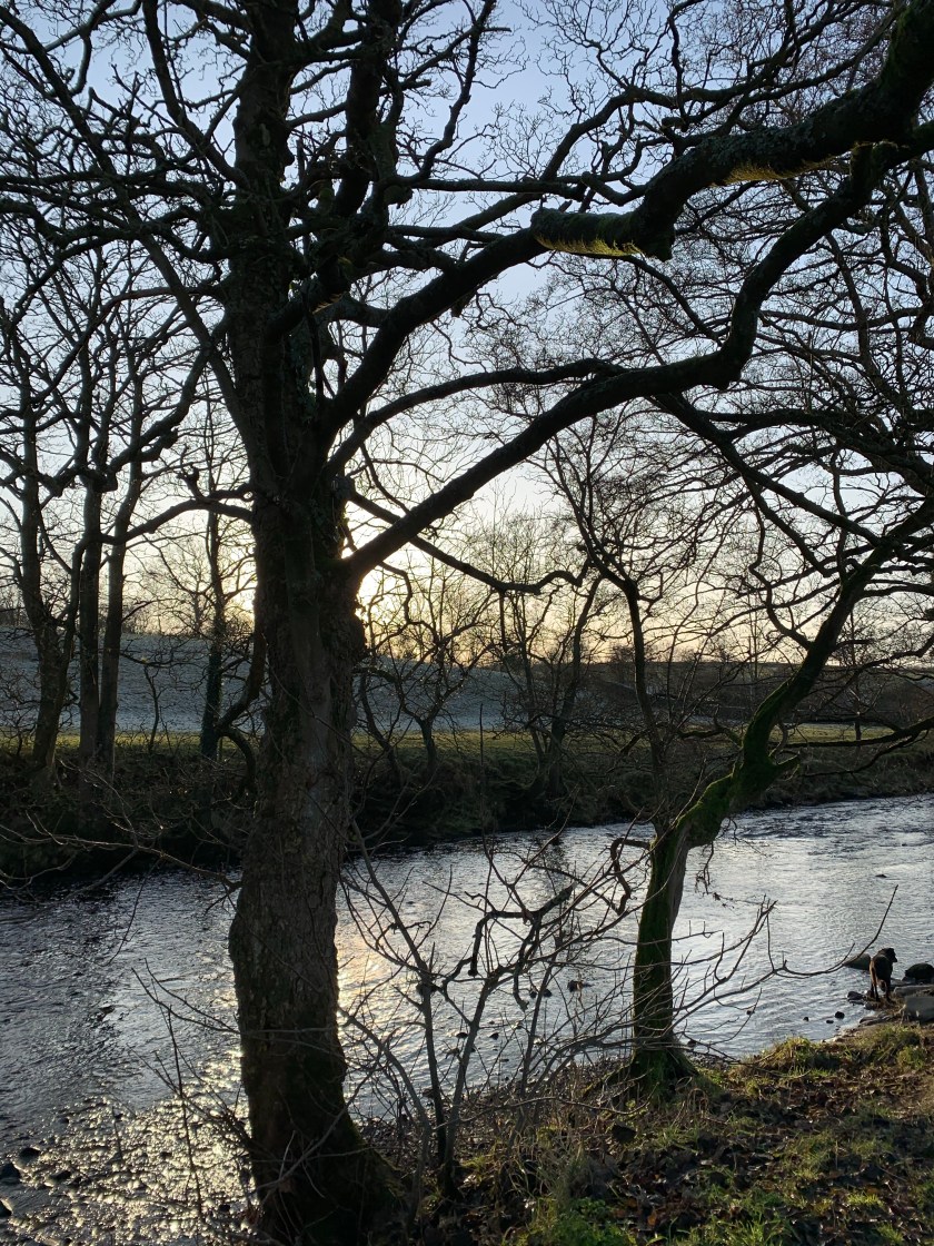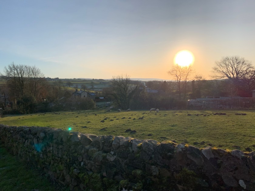 We followed the river, flowing high and fast. The sun was starting to lose height and its warmth. It was chilly in the shade. We sauntered back under the railway tunnel and back into the village. We walked up a little incline and got a fantastic view of the Forest of Bowland, a vast moorland stretching down to Slaidburn some 12 miles south. Despite the name, there is no forest – it’s an ancient name for hunting grounds – apart from small patches of Forestry Commission woodland. With the sun setting, it was just a dark silhouette with distant wind turbines turning lazily on the tops.