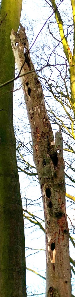 I started noticing all sorts. We turned off down towards Clifford Hall, a huddle of houses and down to the fabrication site. Here The Dog gathered pace as the woods were just around the corner and there were squirrels to seek. There were good views of the village and Dales beyond. The Dog ran around unsuccessfully while I stood and looked. The remains of a tall tree trunk riddled with holes – obviously where woodpeckers came to hone their pecking skills. Another tree, weak and feeble, toppled by wind and gently caught and held by its fellow neighbours. They almost spoke “hey don’t worry, we’ve got you”.