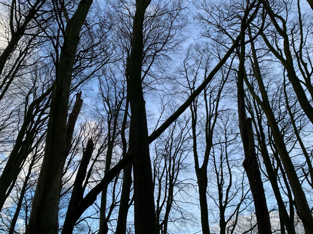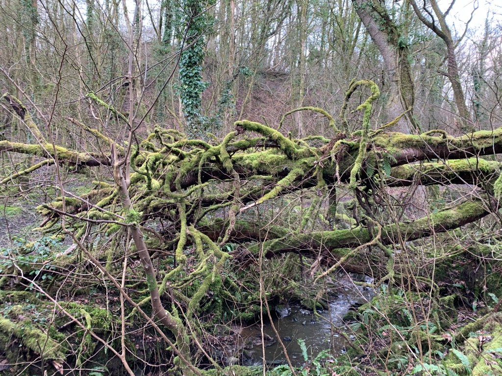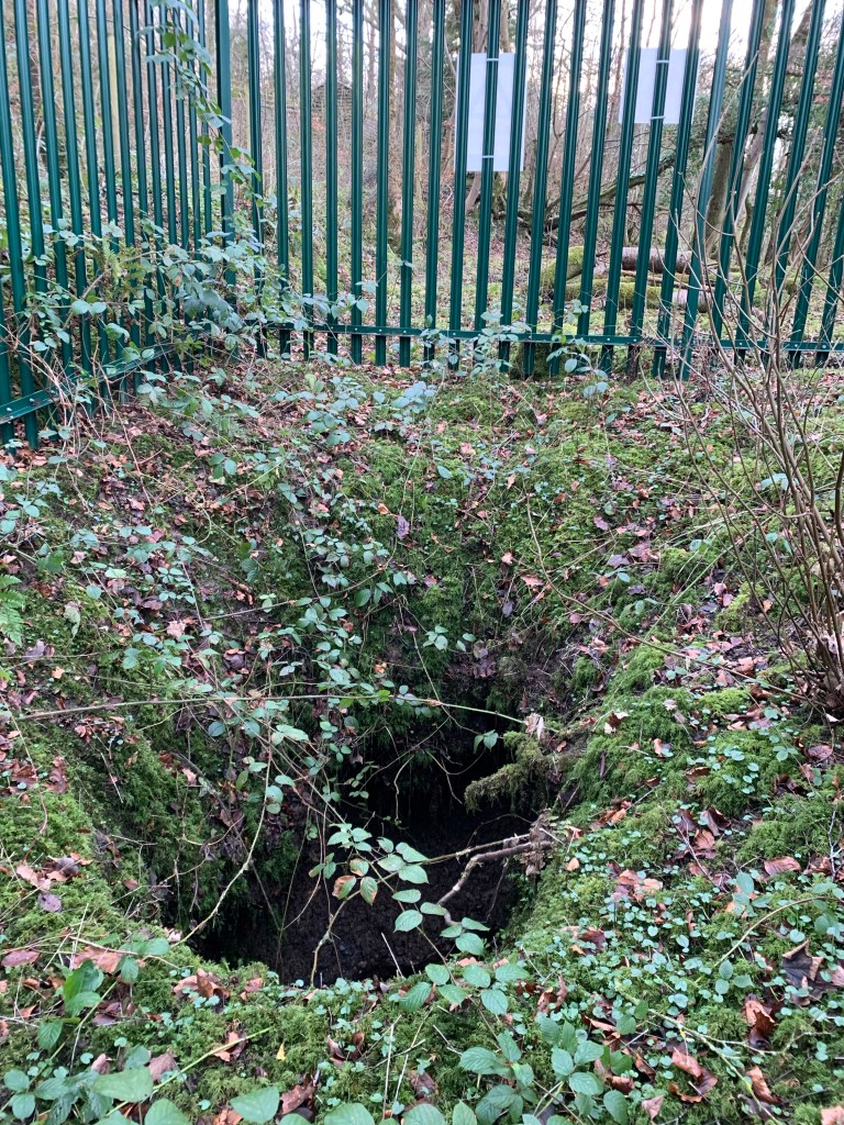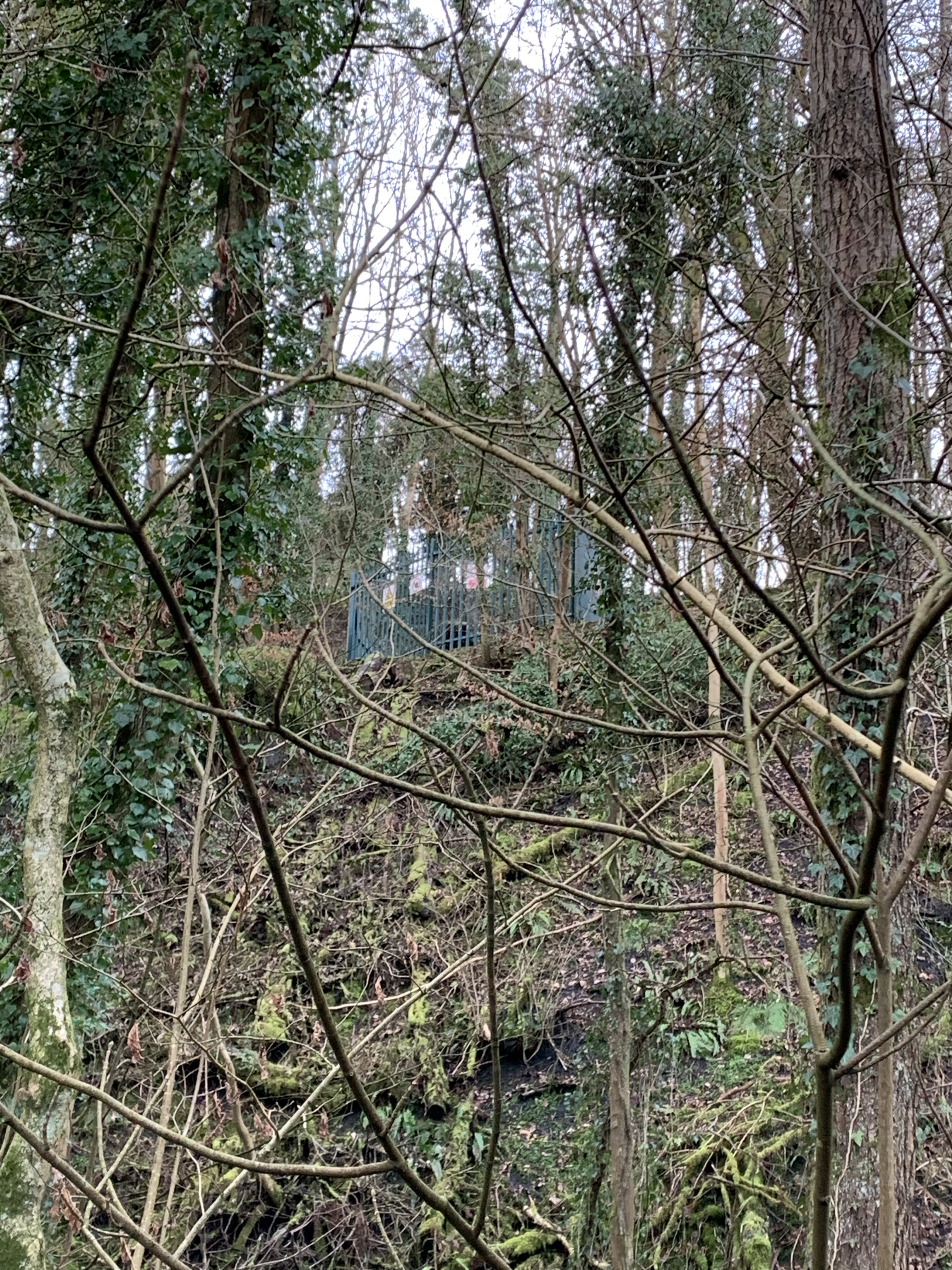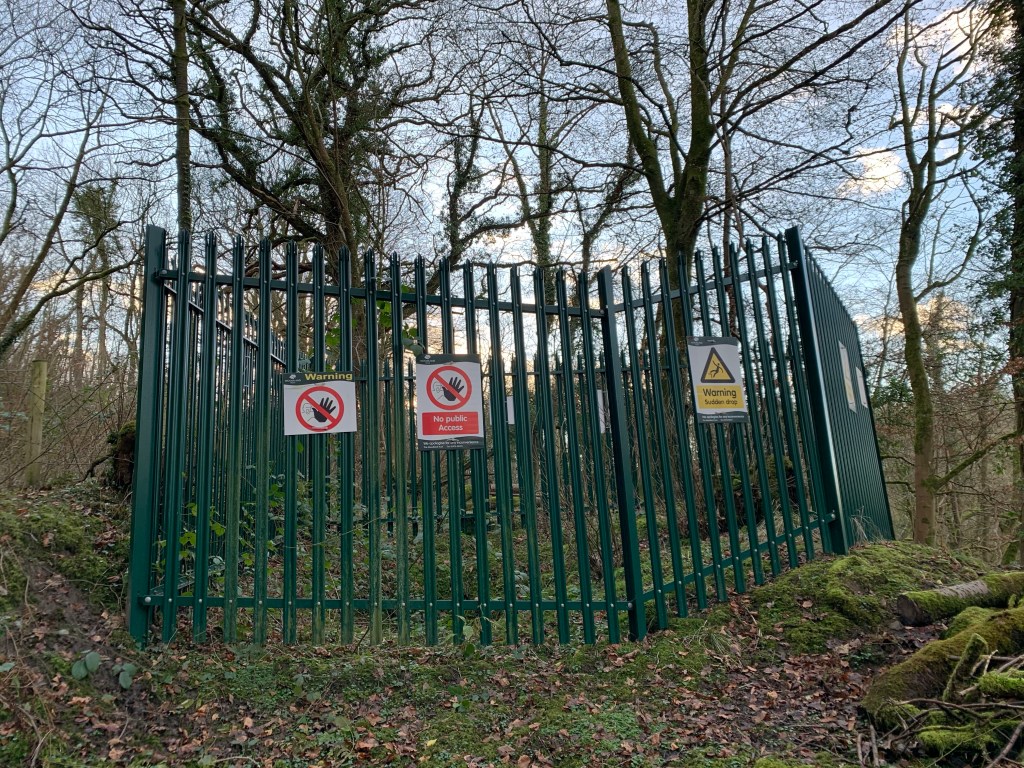 The Dog and I carried on until I spotted something perched high in the woods. I had never seen it before and wondered why I hadn’t. It looked like an electrical sub station, from a distance, surrounded by high metal railings, but was in such a ridiculous spot. I clambered up, slipping and sliding, expecting to fall on my bum in a muddy mess. As we approached the railings, I realised the signs weren’t all about danger of death, but of a hole in the ground. The wood is full of little quarries and is known as a small local coal mining area many years ago. It must of been one of the shafts. I could see why it was cordoned off, hidden in the undergrowth. I could imagine people disappearing down it like Alice in Wonderland! There were no other signs to tell you it’s history which was a shame. The wood is owned by the Woodland Trust and thought they would be more forthcoming. The railings looked pretty recent – maybe that’s why I had only just spotted it. It was intriguing.