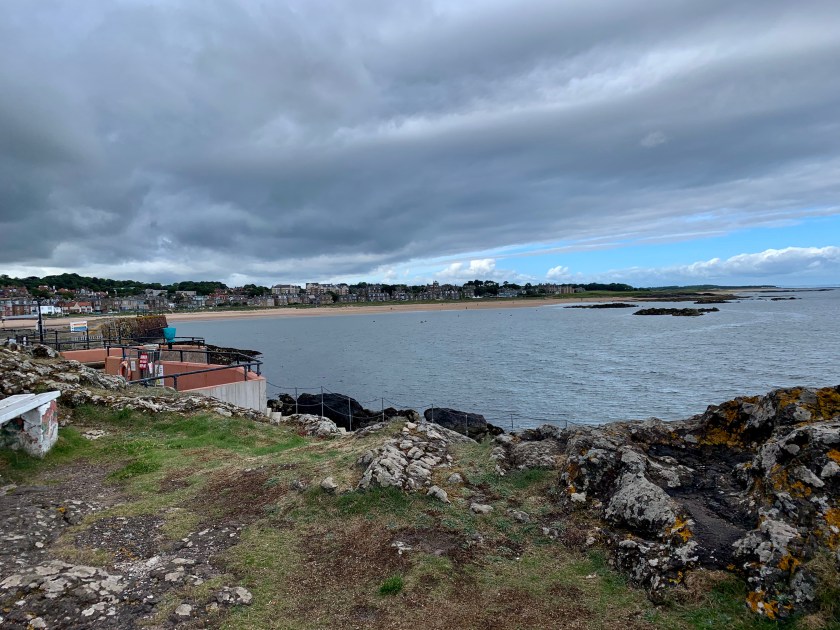 The sky is getting blacker and blacker, really dark. Of course, I’ve left my raincoat in the van and can imagine getting drenched in the middle of the beach. Again, it’s quite cold – no worries it’s only July. We approach the harbour, walking past the little seawater lido built into the sand – a few brave souls braving the elements. We have a wander around. Little cottages and warehouses line the street which opens to a little harbour. We cross over to the harbour walls and out to a little spur with long range views of other side of the Forth and Bass Rock. A metal bridge prevents The Dog and I going any further. It’s a rather pleasant area with a museum and sealife/information building. There’s a cafe with a grassy area and tables, but it’s quite busy. So we head up a terraced street, all brownstone houses and built in the typical Scottish style, and come across the High Street. Remarkably, it is starting to brighten up, the black clouds being pushed away. The High Street is buzzing and has a great selection of shops, again all very charming. We stop for a coffee and park ourselves outside on some tables, when we realise that the sun has come out properly and we’re sitting in the shade. Doh!