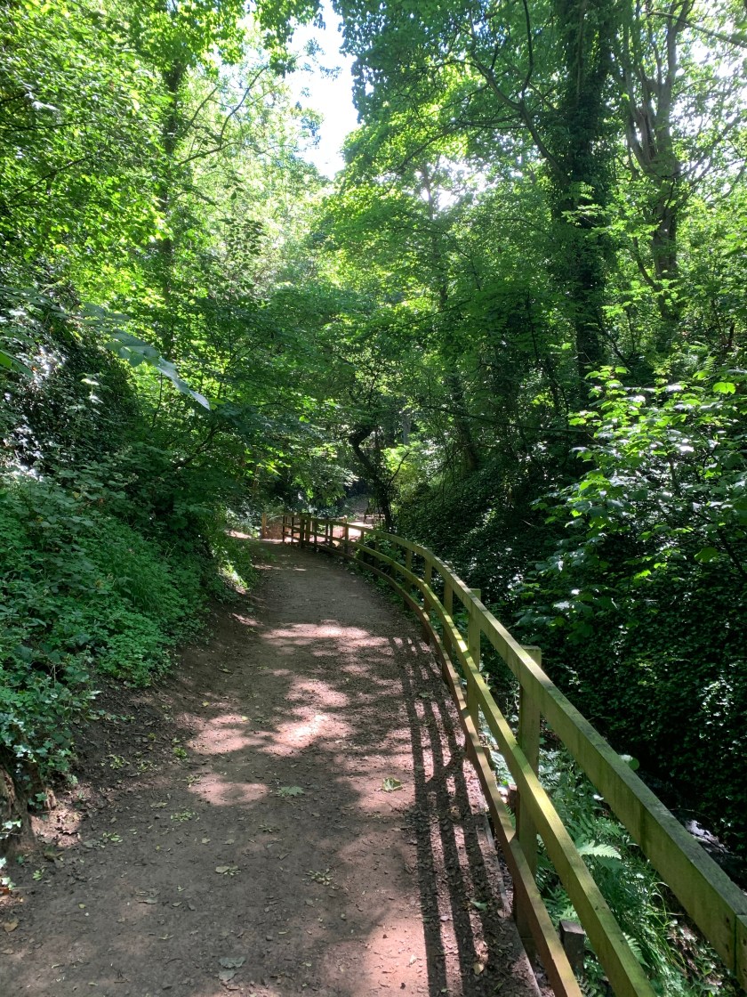 We decide to take another route back to the campsite. As we turn the corner onto the main road, there’s a delightful little communal gardens with benches in the sun, just yards from the fish and chip shop. That would of been a much nicer spot to have lunch! Shame we hadn’t seen it earlier.(Seems to be theme here of picking bad lunch spots!) We walk along the main road and then peel off to a wide open parkland. It leads back to the beach, but there’s cars parked everywhere now and the road is busy. It puts us off going back onto the beach. We find another entrance to the park and walk towards the golf course clubhouse. The path veers right and leads us up into a woodland, speckled with dappled sunshine with a pretty little stream running through it. It’s quite enchanting. We are very impressed with North Berwick.
