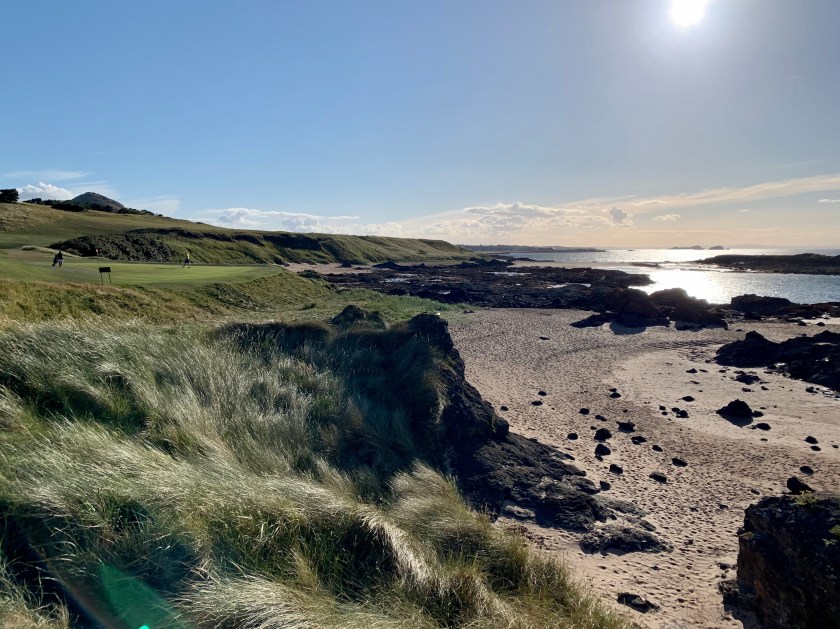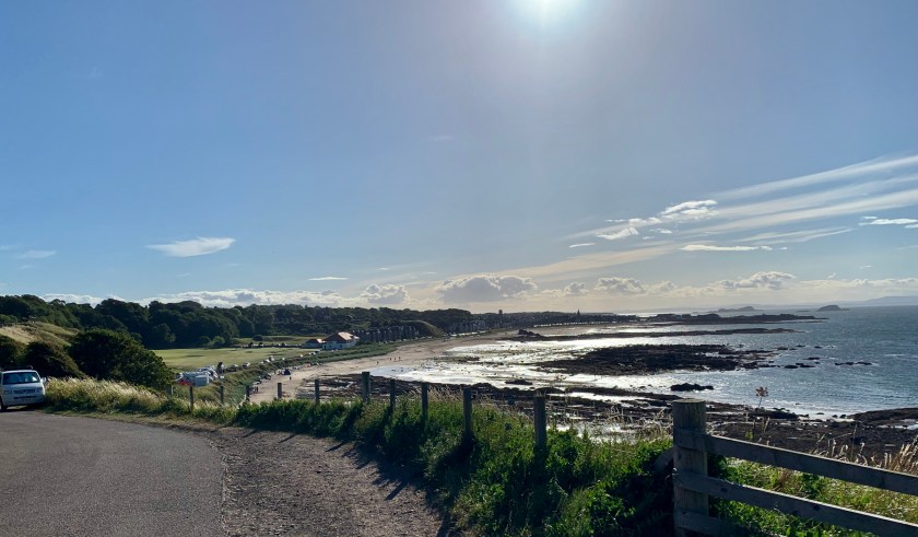 The High Street gives way to some handsome villas and grand houses, set back in lovely gardens. We’re liking North Berwick very much. Very respectable and charming. It seems to be a very nice commuter town with Edinburgh being only some 30 odd miles away. We cut down a side road, popping out by yet another golf course and beyond that the west beach. To our right, is a putting green with a sign declaring that it soon would be converted to a 200 space car park. I was aghast! Together, it was a lovely open green space with fabulous views. I was very tempted to sign the ongoing petition to save it from the asphalt! Just so lazy people can park their tin boxes as close to the beach as possible. I hope the good residents of North Berwick save their open space!