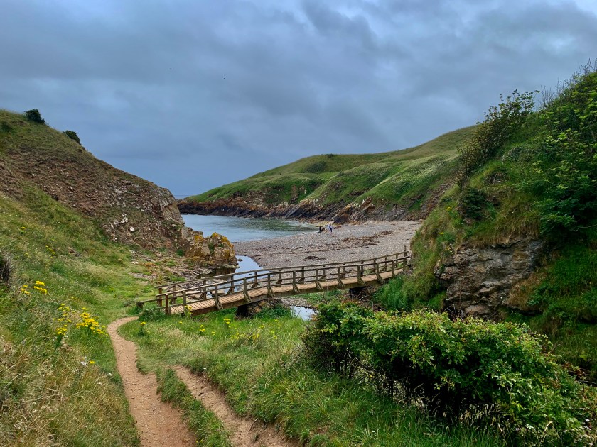 So we waved at Haggerston as we shot past, and carried on to Berwick Upon Tweed, a pleasant little town on the coast. We weren’t in the mood for wandering around a town and so continued on the A1, and crossed into Scotland a few miles from Berwick. We dropped into the little town of Eyemouth and gave it a quick tour – it looked quite nice, but the parking of our vehicle sort of put us off. (There’s pros and cons to this motorhoming lark). We followed the road out again and decided to check out St.Abbs, a bit further north for some reason. We actually ended up at The Mount and the cutest little bay. We managed to wedge the Van into a car parking spot, and walked down the short hill, to find a little cafe, toilets and a little bay of sand with several delightfully painted beach huts set back, all surrounded by rock. It was lovely and several other people thought so too, as it was quite busy with families playing on the sand. We picked our way through and headed to a grassy headland and climbed up. Here there was a bench overlooking the bay and so we sat down to admire the view. What a lovely little place. We then carried on walking, clambering up to the summit of the headland, before following the path to the next cove. This one was a pebbly one, accessed by a wooden bridge. We stayed here quite a while, skimming stones and throwing a stick in the water for The Dog. Apart from a mum and her son, we were the only ones here. We cursed that we had left our crab sandwiches in the Van – we weren’t expecting such a perfect place for lunch.