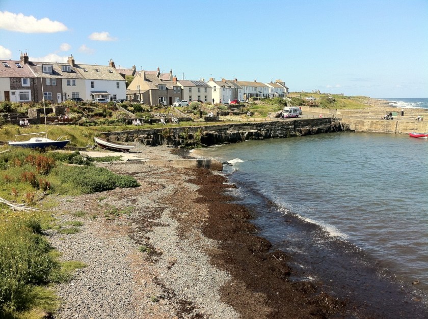 We wake up, after a decent night sleep, to an okay sort of day. We have tea and biscuits in bed and then get ourselves organised for the day. We decide to go for a circular walk and pack a rucksack. We walk down the little wooded footpath again, but before we get to the barley field, we do a right, clamber over a stile and follow the edge of another field of wheat heading towards Craster. The sky is overcast and heavy. We pop out on a small minor back road and drop down towards Craster cutting a corner off via a footpath. We come up to a small cafe and the tourist office which is firmly shut. We wonder whether to get a coffee now, but decide to go into the village first. We wander through little streets of dinky cottages and bob out by the Kipper Smokehouse and a pub offering crab sandwiches. As it’s a bit early for lunch, we continue down to the harbour. Craster is a small fishing village, seemingly very sleepy, but can imagine it being overwhelmed with visitors. Today, with people still creeping out of lockdown, it was rather nice to wander around. It was quite pretty, with the little harbour and the surrounding cottages. A large council estate was tacked on the edge of it, which doubled the size of the actual village.