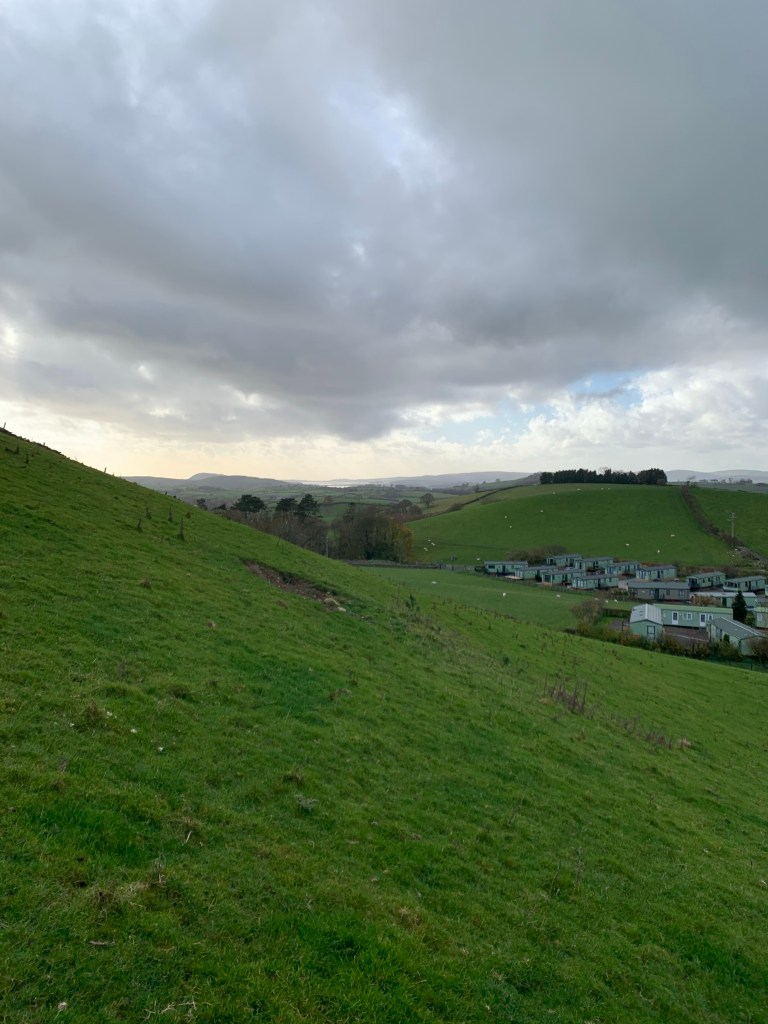 We were now in a dilemma as this was the last field before Endmoor and the car – some 300 yards of field separated us from the car. We could almost see it! The other options were to retrace our steps back to the A65 and walk along an extremely busy country road or find an alternative route. With the sun sinking, we looked for another way round and discovered, by walking further up the field we were in, another gate into an adjacent field. We clambered over and started walking, hoping not to meet the farmer as we were technically trespassing now. We saw another gate further along that actually went back into the cow field, so we headed for that as that would get us ahead of the cows. But as we negotiated the hill down, the cows spotted us again and quickly worked out our cunning plan. They all started to trot towards us, delighted in the thought of having us for company again. Oh for goodness sake! We abandoned the plan of entering the field, but walked parallel to it, along the hedge line, hoping that there was a gate at the other end. The cows still continued to follow us, but gradually their interest waned as they realised that we weren’t coming into their field to play and even the more determined ones gave up and resumed their grass consumption. However to our dismay, we found cows in this field too, but luckily they were high up on the hill and calmly continued eating the grass, unbothered by us traipsing through. With a big sigh of relief, there was a gate and we happily squeezed through onto a tarmac road. From here, we walked past fields and the waterworks before finding the car, and jumping in with relief.