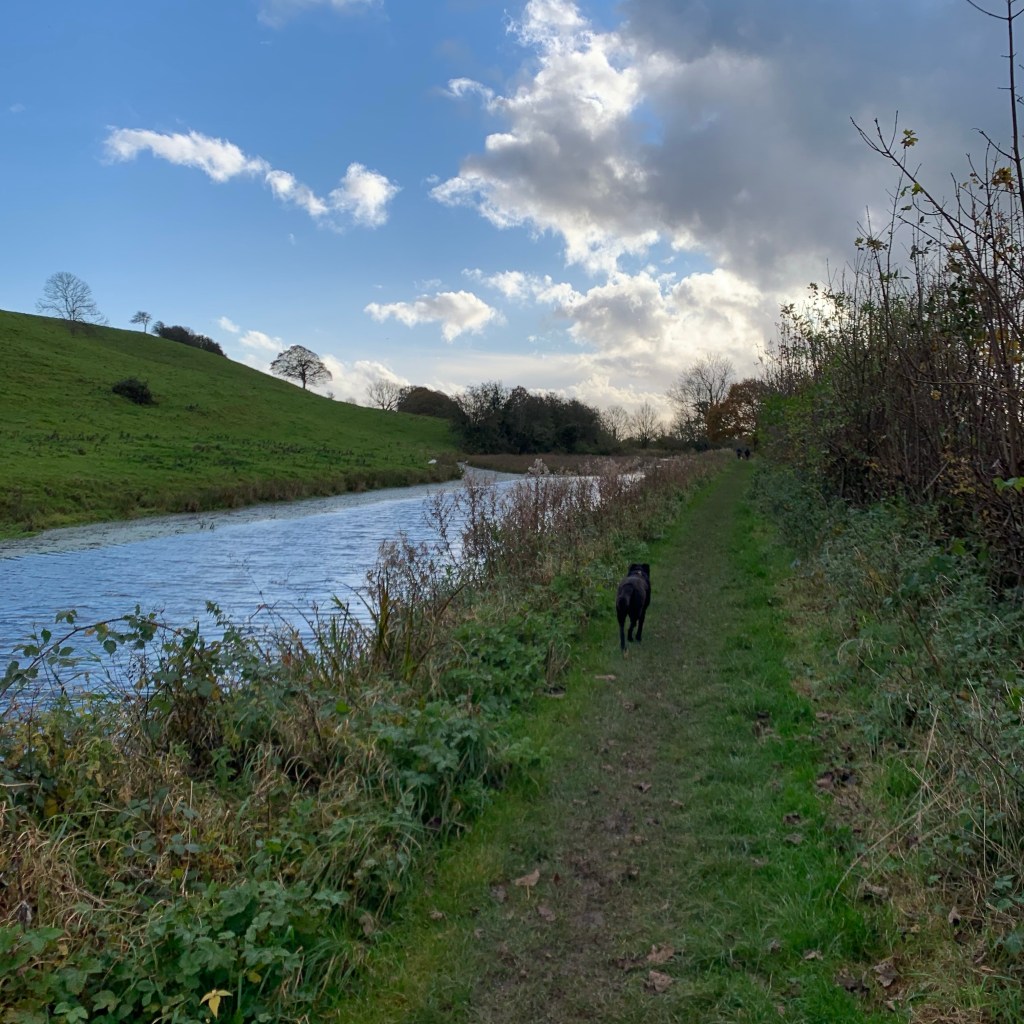 Facing us was a very steep hill in a sheep field, which isn’t good when you haven’t warmed up. So we plodded up, stopping to “admire the view” while we gasped for breath and rested burning legs and The Dog watched impatiently. But once at the top, we had splendid views across the south Lakelands before immediately plummeting back down towards the farm, as skittish sheep galloped off. We squeezed through wall stiles and contoured along before coming to a field full of cows. Cows can be a bit unpredictable and there had been recent news reports of people being killed by them. So we kept close to the wall with one eye on the beasts, but they were more interested in eating the grass and we were thankful to reach the other side. We wandered through fields and along footpaths and lanes before we came to the pretty little village of Stainton and a little humpbacked bridge across the little beck. We then picked up another field and wandered across towards the Lancaster canal. The sun was now out and picked up all the autumnal colours which were glorious. We found the canal and walked along a small footpath through trees, looking for a bridge that would take us to the main towpath opposite. We found one bridge where animals had congregated, their hooves had churned up the mud and turned it into a gloopy soup where we slipped and slid, and got a bit grubby. So we continued to the next bridge and to our delight, managed to cross and drop down onto the gravel path. The Dog came off lead, much to her delight and sauntered along back to the community of Crooklands, passing the Westmorland County Showground where we got a canal trip along the Lancaster Canal and discovered from the volunteer historians that this area was a main port of call with warehouses, jetties and coke ovens. There’s nothing here now to suggest that it was an industrial area at all – just information boards surrounded by fields.