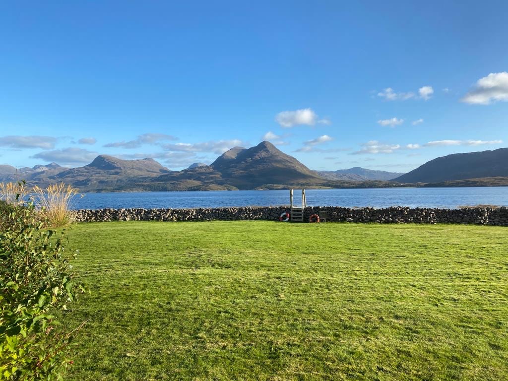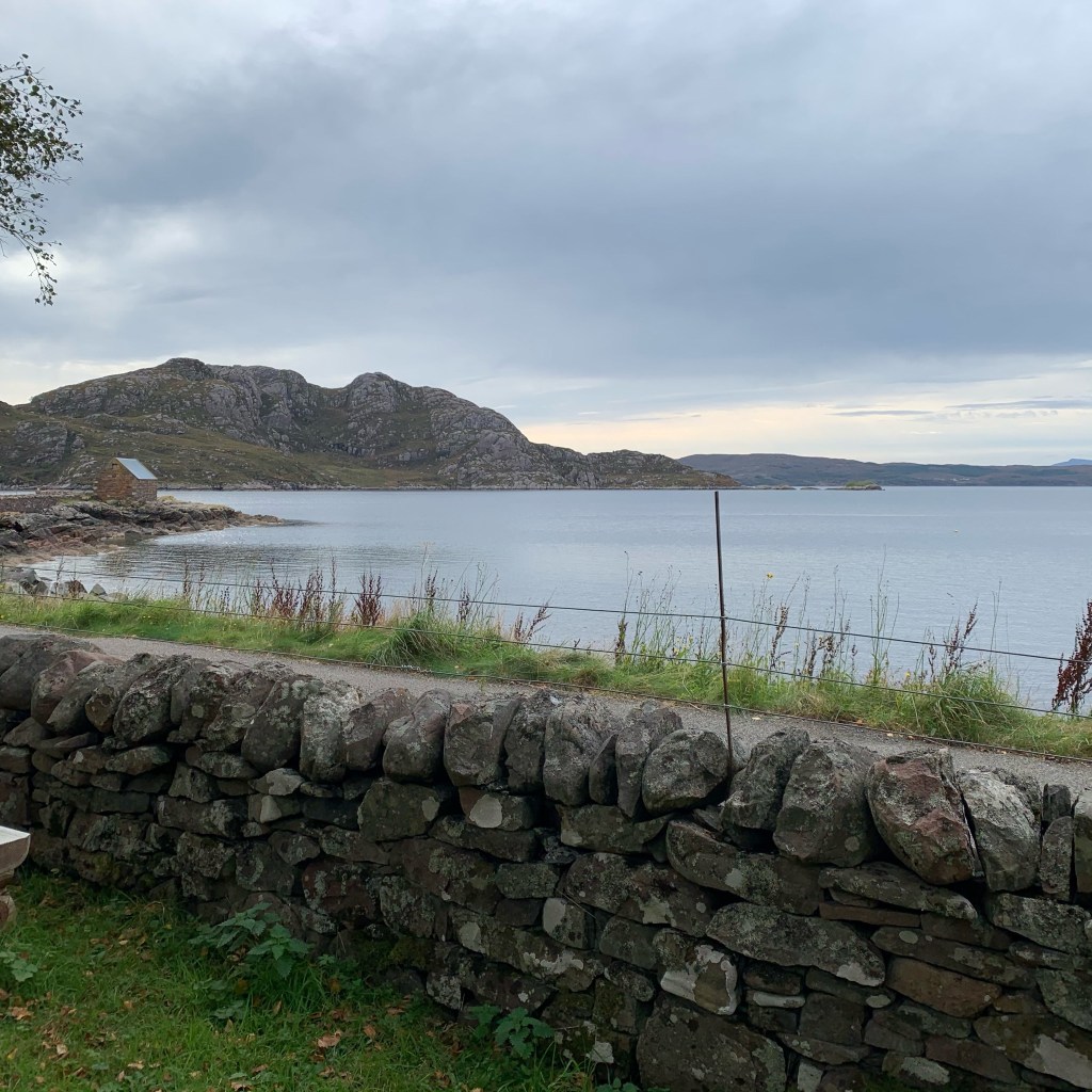 We stayed here last year, just the two of us in a large 5 bedroomed holiday cottage, after our large group was whittled down to one household due to Covid regulations. It was great to be back. We dropped down the steep hill to the house and meet the other four friends hanging out in the sun room. They were all up on a week’s break to bag Munro’s, cycle, walk and enjoy the area, which was the big plan last year. After a cup of tea and cake, we all decided to drive up to Diabaig, a little hamlet four miles up a dead end road. It’s in this beautiful little bay and last year, when Hubby and I were up here for that week, we walked around the edge of the coast and rewarded ourselves with lunch at the Gillie Brigdhe. Alas today it was firmly shut due to staff shortages (it’s a running theme here in Britain – shortages). The six of us had a wander around, the weather having lifted and the mountains have come out in all their glory, the scenery stunning. The Dog dipped her paws into the waves and we just look out to sea with binoculars, hoping to see a seal/otter/porpoise/sea eagle. But all we see is another squall of bad weather approaching, enveloping the outlying little islands as we watched. The wind is quite strong and The Dog’s ears flapped wildly. We headed back to the cars and wind back along the single track road, avoiding the potholes and disintegrating edges. Once in a while, a length of road has been resurfaced – black and smooth, but only lasts a few hundred yards and you are back on the old rough stuff. It’s a challenge on these roads.