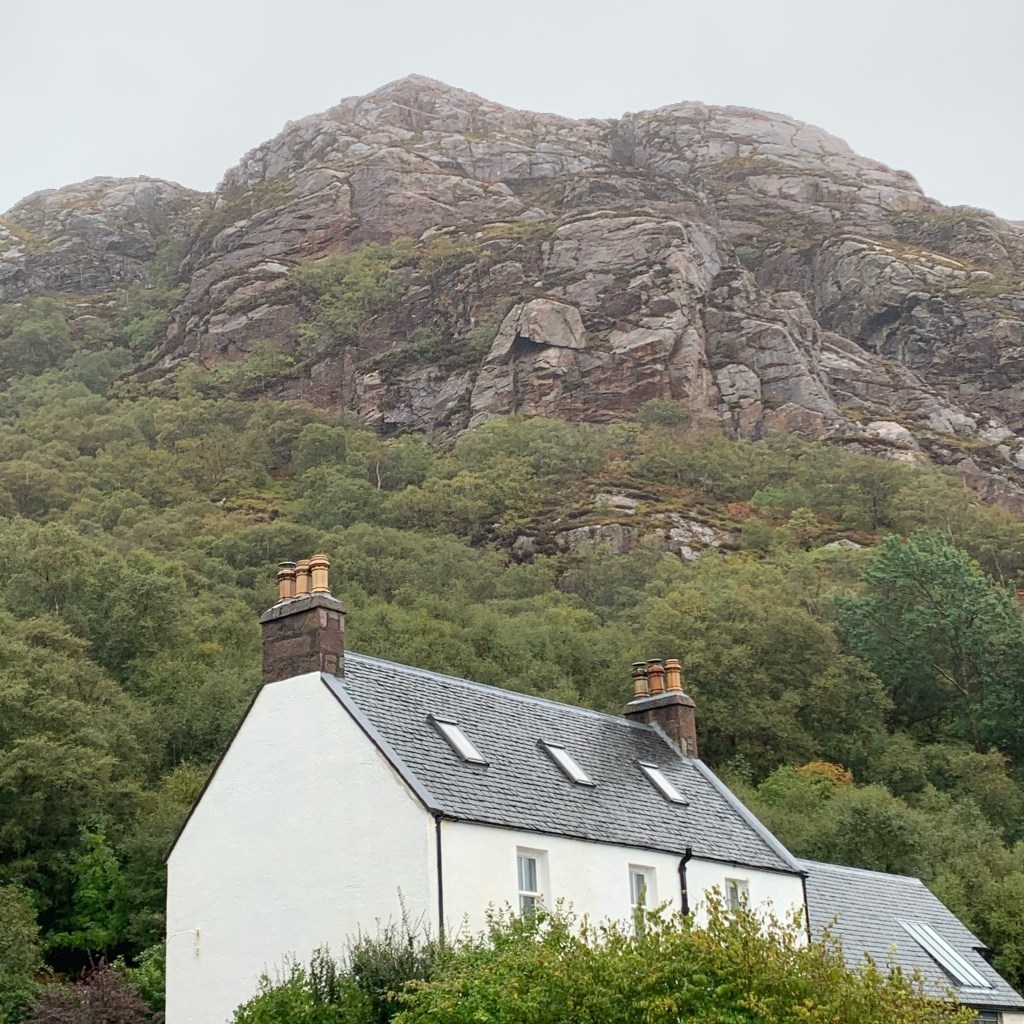We finally turned left into the single track road with passing places at Linlochewe and meet four of our friends on their cycles. They’re out on a cycling day out. It’s now starting to seriously rain after a reasonably pleasant morning. We waved furiously and managed a brief chat with them before continuing along the road. The cloud is low and obscuring the magnificent mountains that line this beautiful valley. Half way along, we spotted a large lorry at an jaunty angle and as we approached it, realised that its front wheel had come off the road and sunk in the soft ground beyond. It was well and truly stuck, leaning at a precarious angle. There was a recovery truck preparing to rescue it, the operator muffled against the horizontal rain. There was just enough room for us to squeeze past, wondering how the driver of the stranded truck was going to explain that one to the boss…..We stopped at the village of Torridon with its little village shop and cafe to get bread (we’ve had instructions) and considered a coffee and cake, but it’s chucking it down now and we can’t go inside. We decided to head the last few miles to Inveralligin and the cottage where our friends were staying.