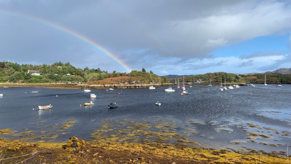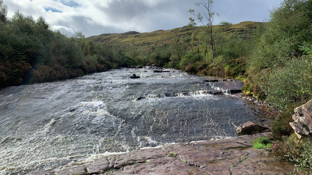 We dozed until about 8:30, when we think it’s polite time (and at least somebody will be up) to enter the house for breakfast. The mountains on the other side of the loch are dark and scuffed by low cloud, but a little while later, it all lifts and the sun pokes its head out, albeit briefly and makes a rainbow. We have seen so many rainbows since arriving yesterday – really vibrant ones, full ones, half ones, double ones and faint ones. The full spectrum of rainbows and a wonder to watch. Three of the gang go off to bag another Munro (one of the team left early this morning to head home) and wrap up for bad weather walking. Our four other remaining friends decided to drive up towards Gairloch, so we bunged The Dog in the boot of their car and joined them. The sky is heavy with cloud, but high enough for us to admire the mountains and the jagged rocks, staring high up to their summits. We retrace the road back to Kinlochewe and turn left alongside Loch Maree. The clouds parted to let the sun out and to showcase this beautiful valley, the heathers dark brown and golds covering the mountainsides. White fluffy clouds and brilliant blue sky make a stunning backdrop as we drove to Victoria Falls and parked up. We walked up the rough track, then the little path leading to a wooden platform. A small, but impressive waterfall plunges down the rock into the pool below, bubbling and gurgling. After a few photos, we walked further up to an outcrop of rock where the river flows before channeling down towards the waterfall. The small window of fine weather soon disappears as a black cloud appears over the mountains and gently rains on us. We have a wander further up, admiring Loch Maree and the countryside beyond before the rain cloud catches it, making us retreat back to the cars.