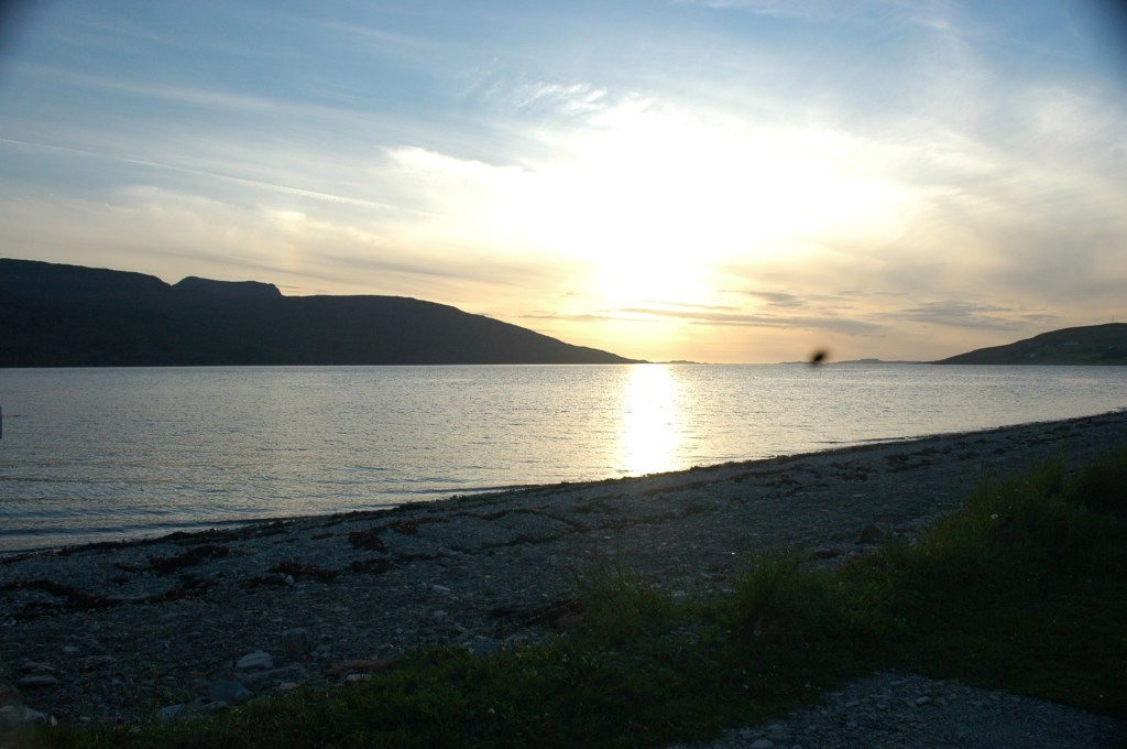 With us all clearing our plates and bowls, tidying up and feeling a little bored by 6:30, we decided to go for a walk. The wind had dropped completely and the dark brooding rain clouds had dispersed and allowed the sun to set behind the opposite hills. Chunks of pale blue sky appeared as we wandered along the shoreline of Loch Broom, watching the Lewis ferry depart from the mainland, its lights bright in the darkening sky. We would be on that tomorrow morning, chugging out to the open sea.We found a large grassy field with a well worn path that we followed, taking us in a big round circle, alongside a fast flowing river. The Dog was off lead and enjoyed poking around in the undergrowth. We wandered back, peering into other vans and motorhomes seeing what the occupants were up too. We prepared ourselves for the evening, setting up the bed so we could watch catch up tv on the iPad and then relaxing.