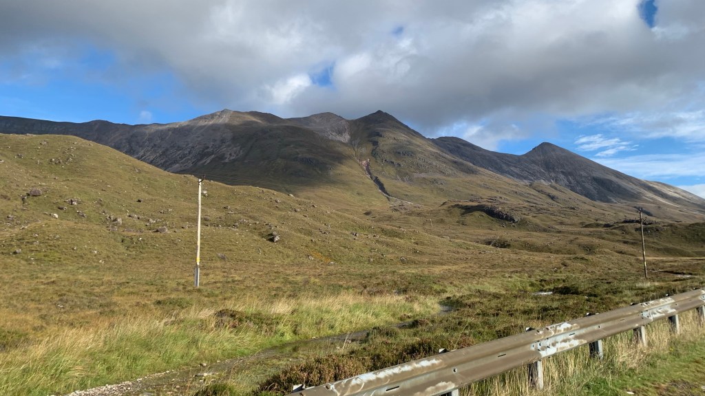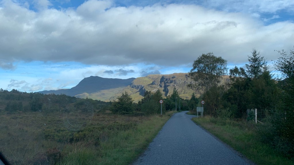 It was raining hard with a stiff breeze when we first woke up, but as we got organised, the sun broke through the clouds and Loch Torridon lit up. Silver rivulets ran down the mountainsides, the streams and waterfalls full of cascading water and the sun glinted off the wet rocky outcrops. It was a beautiful sight. Finally we were all ready to leave and we said our goodbyes to each other before heading off. Again, we have the long 10 mile stretch of road back to Kinlochewe to contend with, where we turn left to Gairloch and ultimately Ullapool. The satnav wants to take us right on the shorter route, but this way is far more scenic.
