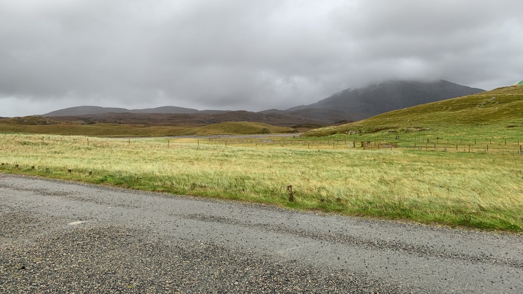 We followed the satnav out of town – it’s actually reasonably large and like any other suburban area, but we are soon out in rather flat, slightly undulating monotonous miles of peat bog territory, the lashing rain not helping the picture. The good people of Lewis like a lot of “Caution” signs whether it be lorries turning, children crossing, concealed entrances or other impediments, but loved the idea that they had a cycle lane on this road too which is more than a lot of cities! We turned right and gradually the undulations turned into more substantial hills and it got wilder and wilder. Now this is more like it. It started to have a primitive beauty about it. The road started to become a single track road with passing places, then back to two lane and then back to single – it kept you on your toes. It had been well tarmacked too and gave us a smooth ride – probably one of the best roads in west Highland Scotland. The road signs were in Gaelic with the English underneath which took some getting use to.