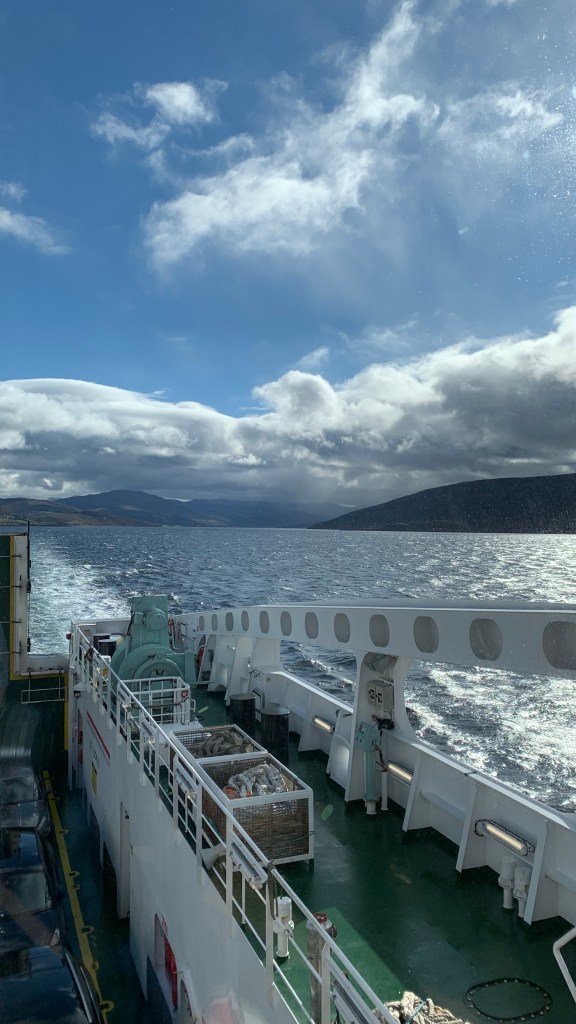 We ended up talking to our fellow VW neighbour and got some good ideas off him about awnings which we are lacking at the moment. This made us a bit late, so we finalised the last Van ablutions and headed around the corner to the Ullapool ferry terminal. Steered into a parking spot by a jovial man in a hi-vis, we had a walk around town to kill time before we boarded the ship. We grabbed a coffee and get back to the Van just in time before a big black cloud dropped its contents on Ullapool. Soon we are invited to board the boat – we drive on and parked in neat rows as instructed before heading upstairs to the lounge. There are certain areas for dogs, so we end up at the back of the boat, overlooking the last of the cars and its rear gate. We can watch the mainland disappear!