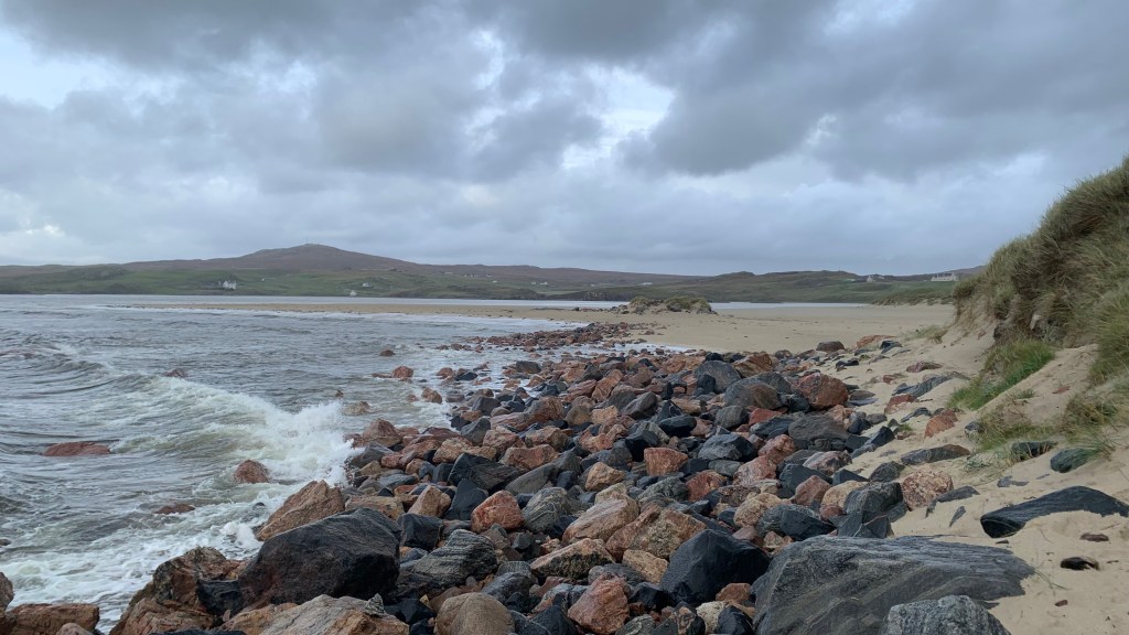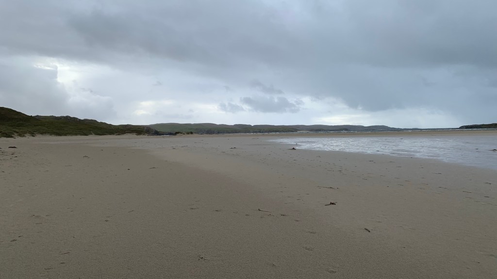 The scattered community of Ardroil heralded the arrival to our destination and dispelled our worry about the lack of amenities. We came across a small shop (albeit shut) with a couple of petrol pumps outside and there was a board pointing down a track marked “restaurant”. A large mast nearby gave us 4G for our phones, the internet and the outside world. We were well and truly catered for. We turned right down a narrow track towards a scruffy little car park and a long low shed. This is our campsite for the next two nights. Through a gate, a gravelled area signified our parking area – enough room for 10 campervans. There was no electric hook ups so we were off grid. It started to rain again as we tried to work out the most favourable angle to park – it’s howling a hoolie too – to protect us from the elements but getting a view too. Finally we agreed and settled for the side door to face inland, the wind and rain battering us on the other side. We set up and decided to go for a walk and investigate the area as the rain had finally stopped – well for the time being. First we checked out the facilities. The long low building was the loo block with five doors, but only one is open. Inside is an utilitarian room of walled melamine, but bright, clean and tidy with a loo, shower and basin fitted out for disabled people to have access too. It was quite pleasant and I’m not one for ablution blocks, as you know. It was even better than the one last night, which personally needs a bit of a makeover. I was impressed. There was even a packet of wet wipes for you to wipe the toilet seat after use! There were bins for recycling and general rubbish, a chemical toilet, taps to fill up your van – everything you’d expect on a regular manned campsite. Okay, it was a bit higgedly piggedly, rough around the edges and a bit worn, but we hadn’t expected any of this at all – it was a bonus. It was all based on honesty with you posting your money in a box. No rules or regulations. No reception. No staff. Just rock up and camp and look after the place while you’re at it, thank you. It was just perfect.