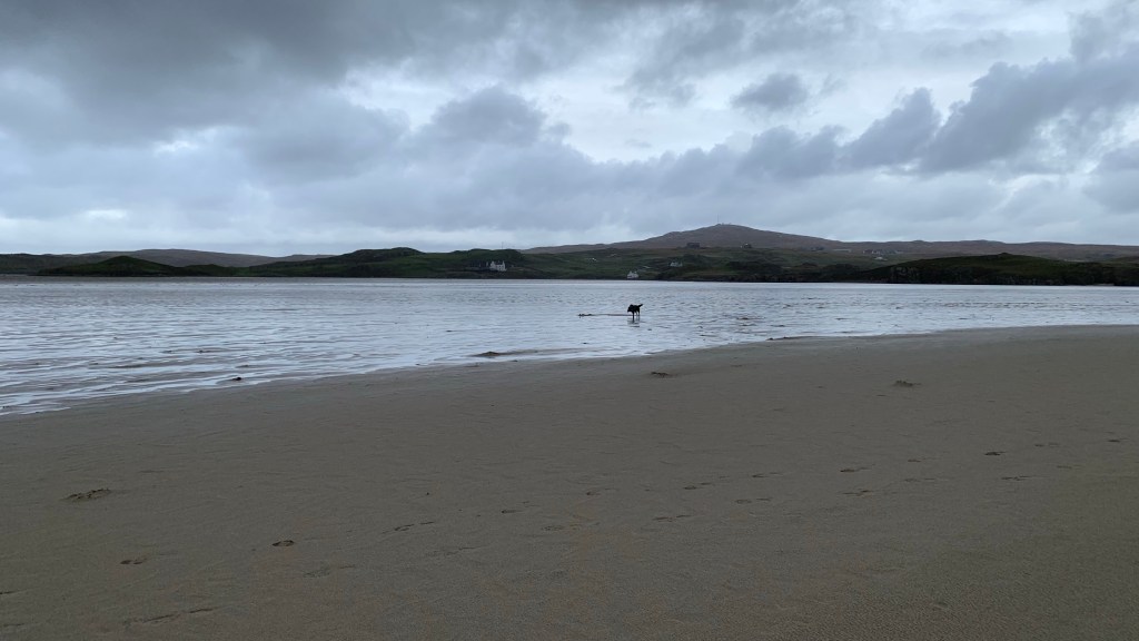 Houses were scattered throughout the region, mainly bungalows chalets with the odd house. There were no traditional stone crofter cottages to be seen, though on closer inspection, a few looked like they had been updated with either pebble dash or render, and then painted white, but no actual stone showing. It struck us that they had probably been pebbledashed for insulation purposes – our own stone house could be cold and always has draughts – here with nothing to stop the Atlantic wind, a stone cottage would be a nightmare to keep warm. Some people hadn’t bothered with the white paint and left the pebbledash in its natural dull brown, which wasn’t particularly attractive. There were quite modern bungalows so we presumed that there was once a stone cottage, too expensive to renovate and so cheaper to put in a new build. A lot of them wouldn’t be out of place in a suburban setting to be honest and one or two were positively down right ugly with no thought into reconciling it with the local environment. There was the odd “Grand Design” property, all wood and high windows, but mainly it was these low bungalows shielded by conifers. The population, though seemingly sparse, was considerable for such an isolated spot down a dead end road – who set up home here, what did they do or was it all holiday homes?