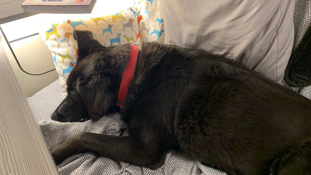 We suddenly realised that the tide was coming and doing a bit of a pincer movement – on one side we watched as it insidiously crept over the sand and could easily cut somebody off. A deepening black cloud out west looked full of water, so we headed back to the Van. The sky seemed to have many layers of different clouds, some still, some scudding with little breaks revealing a little bit of blue. Back at the Van, more campers had arrived – there’s now five vans of various sizes including a motorhome. We kept our side door open and relaxed – it’s not really that cold out of the wind. The Dog watched the world from her vantage point on her mat. We decided not to pop the top up tonight – it’s quite breezy out there and didn’t want any damage, so we were slightly doubled up as we settled down with wine and nibbles. It gradually got dark, so we reluctantly closed our door and made some tea. It’s pitch black outside, but the rain has stopped. The wind gently rocked our Van from time to time. The Dog has taken over the back seat again and is dreaming vividly, paws twitching. Perhaps she’s chasing those sandpipers on the beach again. We turned out the light and plunged ourselves into pitch blackness. Boy it was dark.