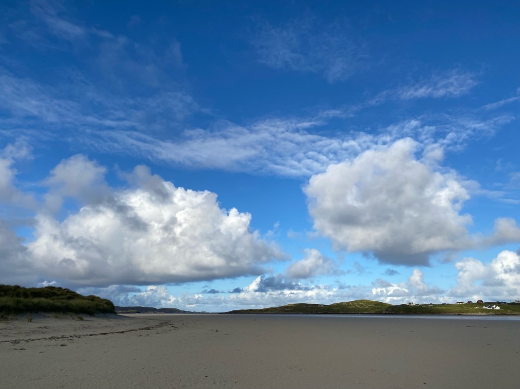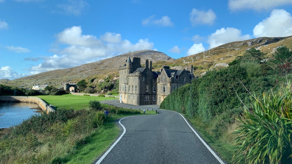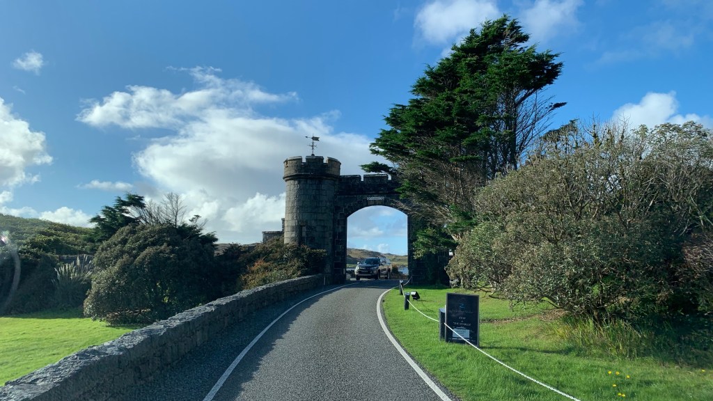 We stopped for lunch in a parking area, high above a sea loch, surrounded by stunning mountains and views. It was just amazing. The sun blazed down. We were now on Harris (though we hadn’t crossed islands, when you look on a map, there is a dividing line on the main island between Lewis and Harris). After an agreeable break, we continued on. Hubby had found out about a campsite down a coastal road, but we couldn’t book it. It only has 5 spaces. We hoped we could get in. We had a brief tour of Tarbert, a lovely little town dominated by the ferry terminal and then back to this coastal road. We had been doing a lot of “wow” “that’s stunning” “ how gorgeous”, general oohing and arring for the last couple of hours and now we went into overdrive. Every turn, there was an amazing view. Our neighbour back home had told us how stunning Lewis and Harris was and he was right. The road had signs mentioning the word “challenging” and it was. Narrow with steep drops, bends and blind summits, Hubby held onto the steering wheel and kept telling me “I daren’t look at the scenery, just the road!”. The scenery is jaw dropping. We travelled about 16 miles which takes 40 minutes along this road – we turned one corner and there’s this amazing castle! It’s full of surprises, this road!