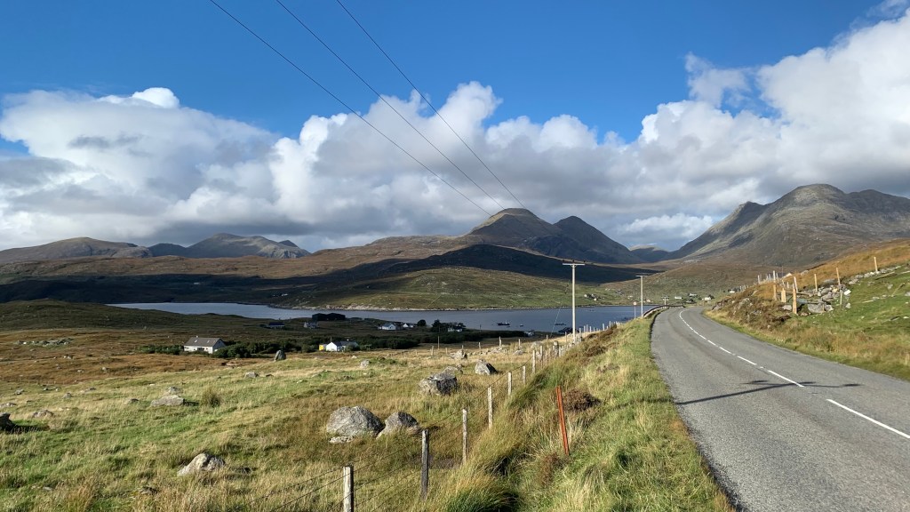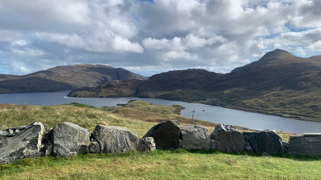 We finally joined the main road to Tarbert, the scenery just getting better and better by the mile. The mountains loomed up again, huge lochs and sea estuaries, straggly villages in the valleys – the houses all of a similar style. There were a few inhabited stone residences, but many were in a state of dilapidation.
