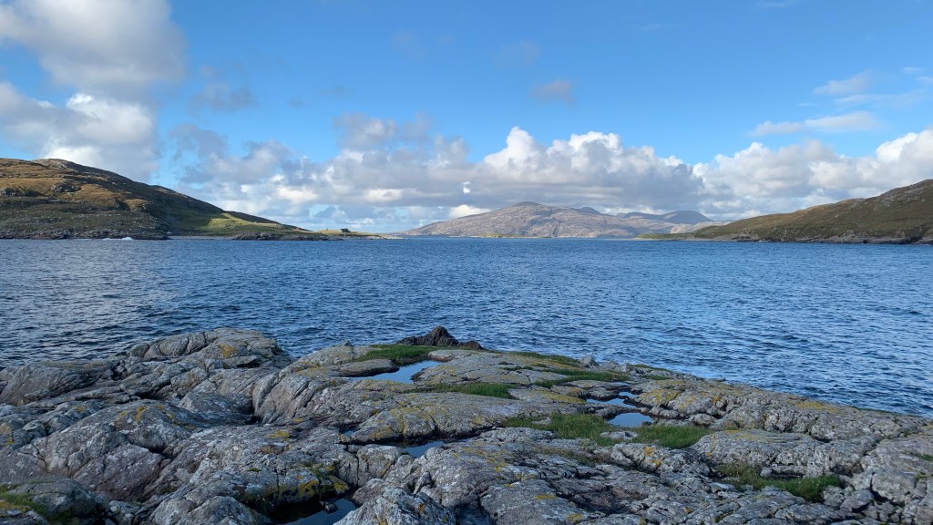 The sun finally slid down behind an island, the temperature dropping immediately. It had been a balmy 13 degrees today with the sun out. Flying insects hovered above us, thankfully not midges, but we hoped they didn’t join us inside. We put everything away and retreated indoors, having soup for tea. It had been a splendid day – our decision to move on was a good one and the discovery of this perfect corner of Harris.