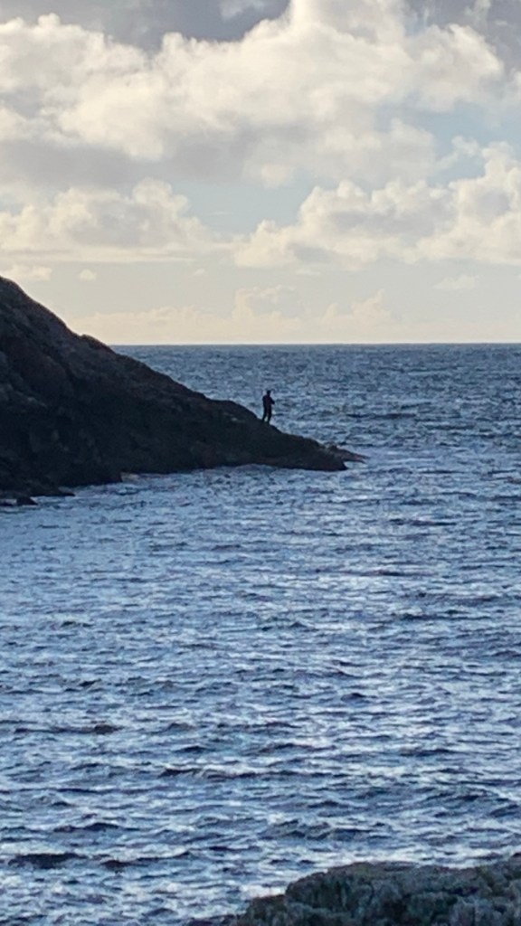You have to text the payment through for the night’s stay. It’s all based on honesty again which is wonderful. £15 – fantastic. The view across the sea was outstanding, the sun starting to set. We had about 3 hours before the sun really went down. So we walked down the road to a little bay of pure sand and again, shoes and socks off and walking in the surf. The Dog was so happy – two beaches in one day!!! We then walked over the hill to the other side – a short walk on a grassy path down to a pier with a couple of parked cars. Another bay with cliffs and coves. We walked up another hill and spotted a man on the edge fishing. Opposite was another island with houses. In the distance another sandy spot. It was endless.