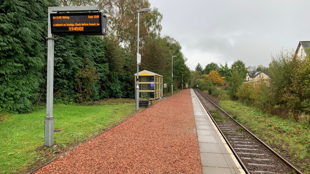 We also found the cafe our friendly site owner had mentioned. We weren’t ready for a coffee just yet, so wandered back to the railway station and waited for our train, checking the train app on our phones for more information as well as killing time. With some dismay, with minutes of arrival, the time was pushed back again to 12:48 reducing our time at Crianlarich down to 10 minutes. That was cutting it a bit fine. Do we go and risk missing that return train, stranded in Cairnlarich until the next train at 8pm? How would we get back if we didn’t want to wait 6 hours – it was 60 miles away and there is no bus service.