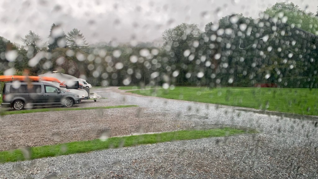 This was the last thing we wanted to do. Sit in the Van in the rain, feeling cooped up. The only thing it made us do,was to make getting an awning our Van a top priority. Since getting the Van late last year, we had been gradually adding bits and pieces as we used it more, but this trip confirmed that an awning was essential – we could of, at least, sat outside under it now as it was quite warm (15 degrees despite the rain) rather than huddled on top of each other. Our provisions would make a pathetic lunch too, so annoyingly we got the Van ready to drive somewhere – the last thing we had planned.
